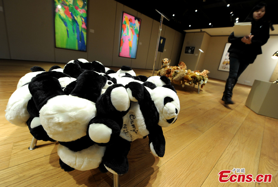 Panda Banquette Chair, made by Campana brothers, is exhibited in Hong Kong on Jan. 20, 2014. Sotheby's held the "Boundless: Contemporary Art" auction preview, which displays photographs, paintings and sculptures, on Monday and the auction will take place on Jan. 23. [Photo: China News Sesrvice / Zhang Yu]