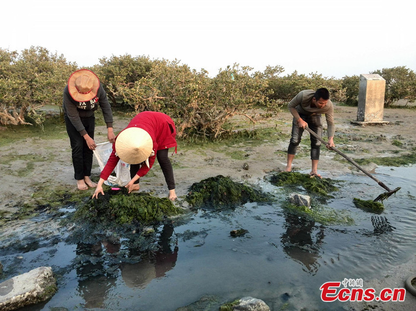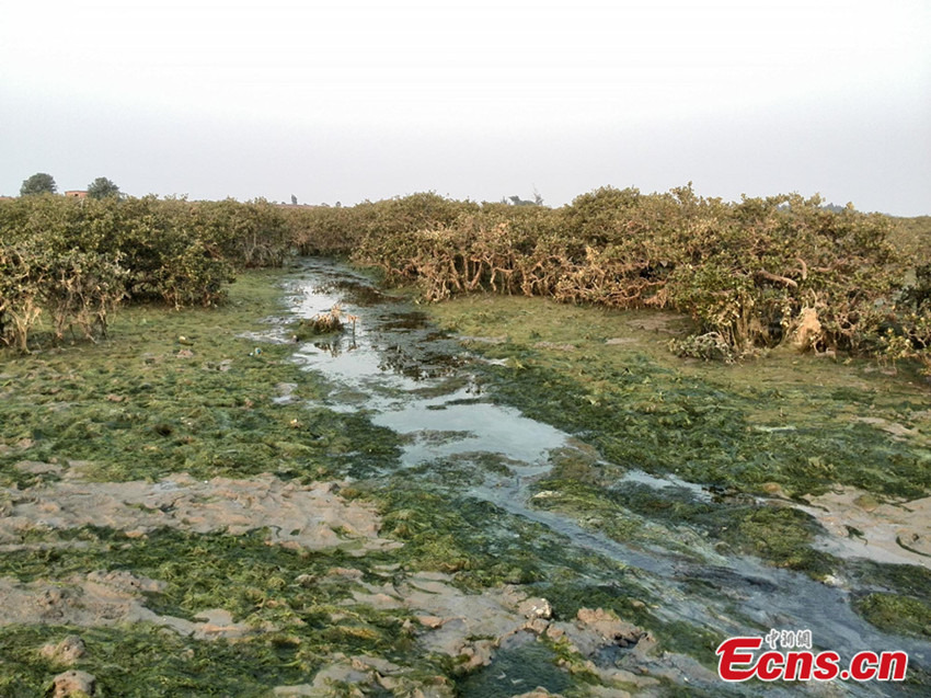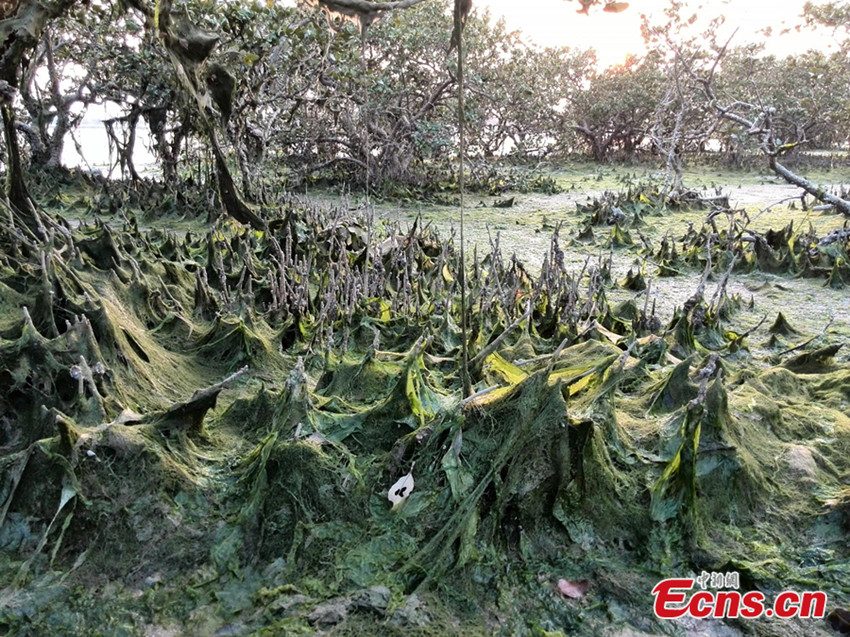 Mangrove forests on the beach are covered by algae in Beihai of south China's Guangxi Zhuang autonomous region on Jan. 21, 2014. Recent algae outbreak covers many mangrove trees on the beach, which may affect their photosynthesis. [Photo: China News Service/Zhai Liqiang]