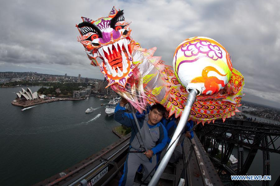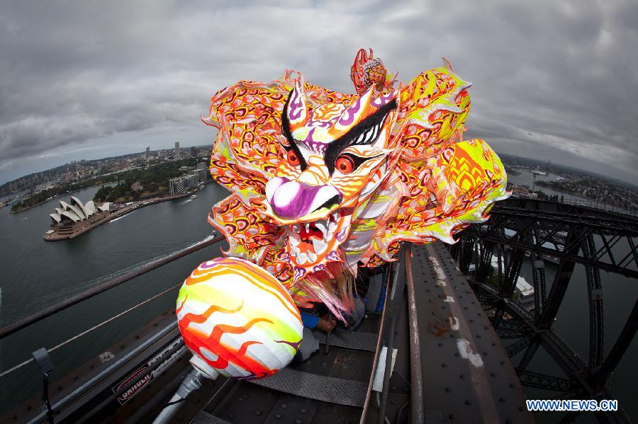 Performers present dragon dance on the Sydney Harbor Bridge in celebration of the upcoming Chinese Lunar New Year in Sydney, Australia, Jan 21, 2014. (Xinhua)