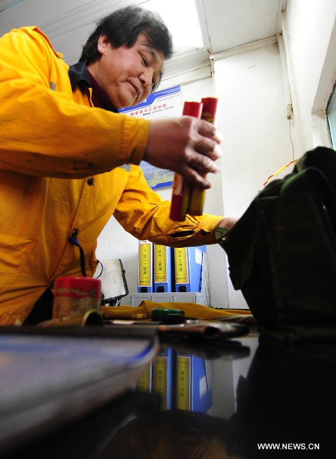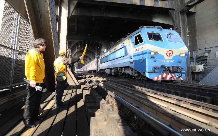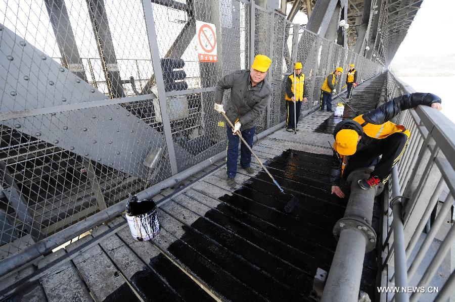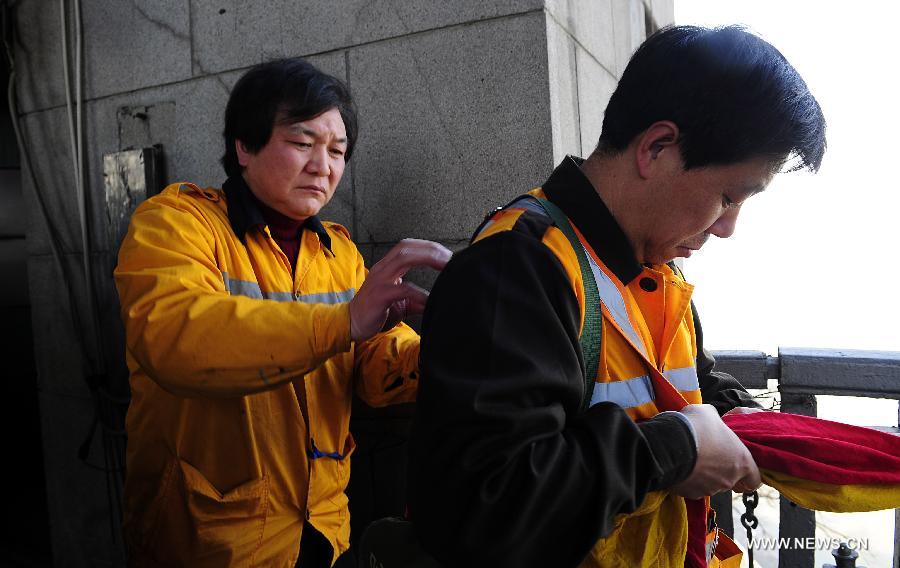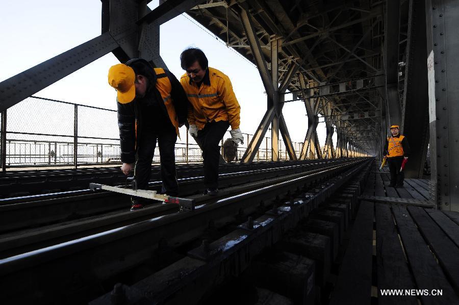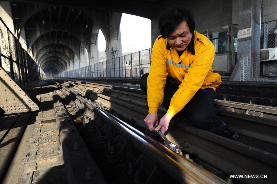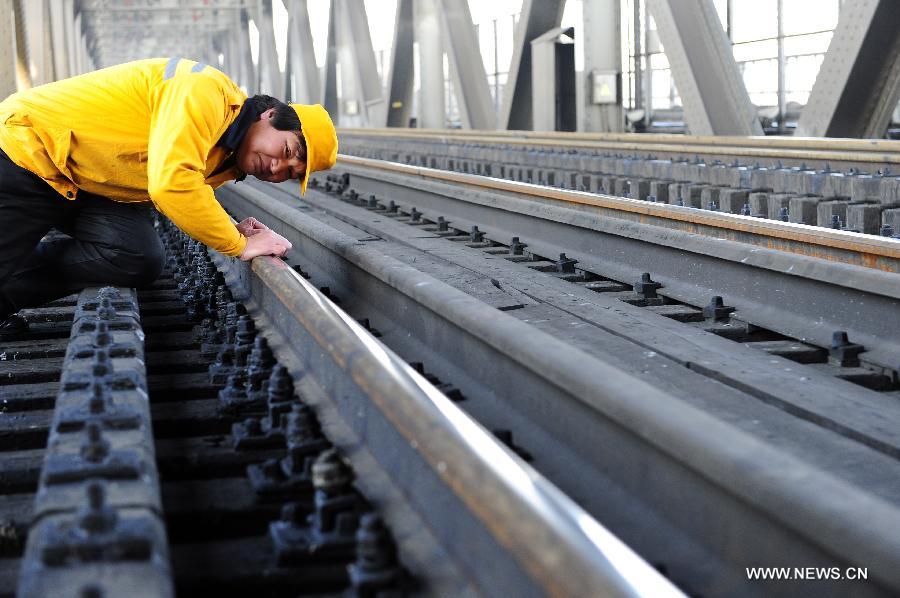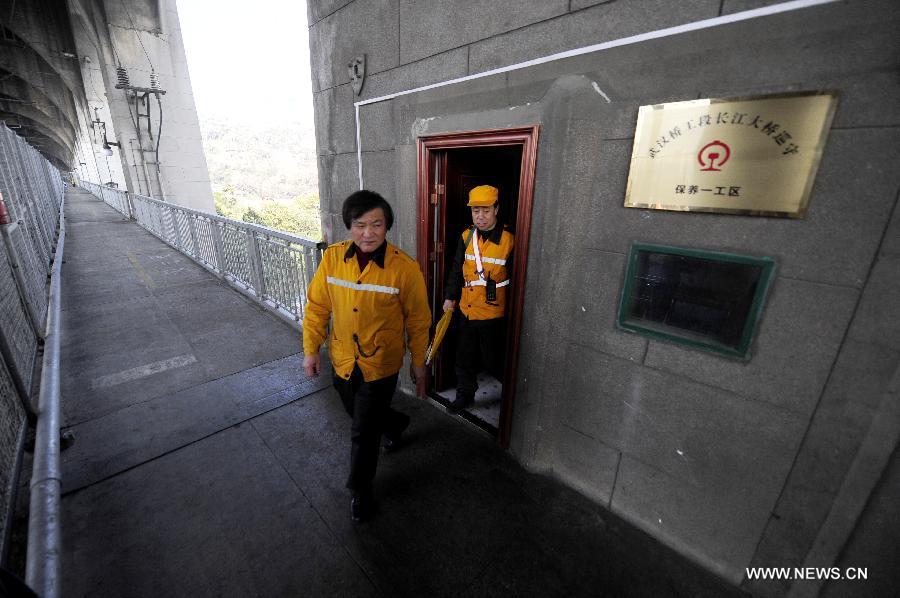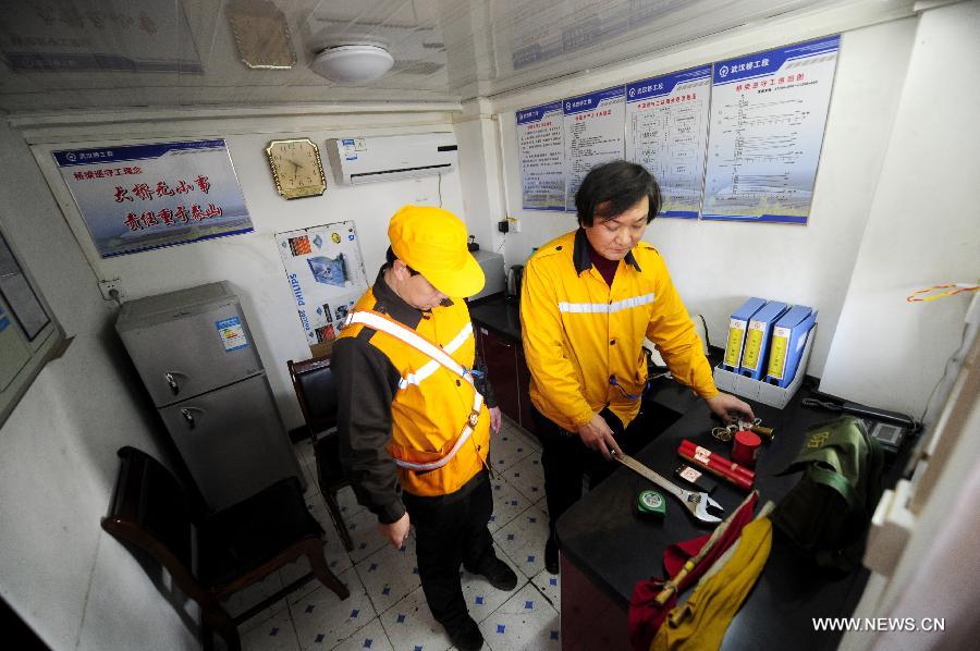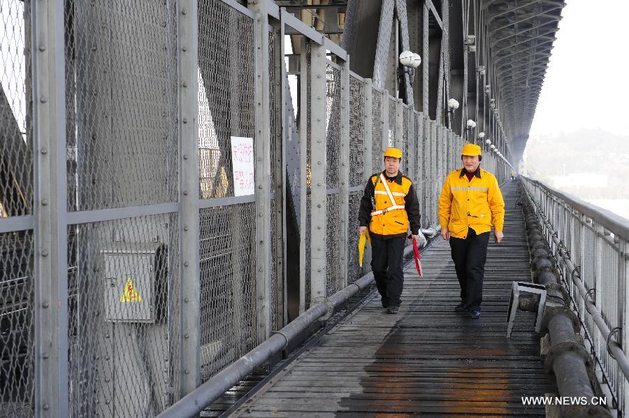 Zuo Linshu(L) and his partner Xi Hongqiang wait for a train on Wuhan Changjiang River Bridge in Wuhan, capital of central China's Hubei Province, Jan. 22, 2014. Zuo Linshu is a trackwalker who is in charge of maintainance work of Wuhan Changjiang River Bridge. Because of the Spring Festival travel rush, more frequent and careful check is needed for the safety of trains. He spends 8 hours to check the track 8 times a day. The 57-year-old Zuo would soon embrace the 34 Spring Festival on the bridge without his family. (Xinhua/Hao Tongqian)