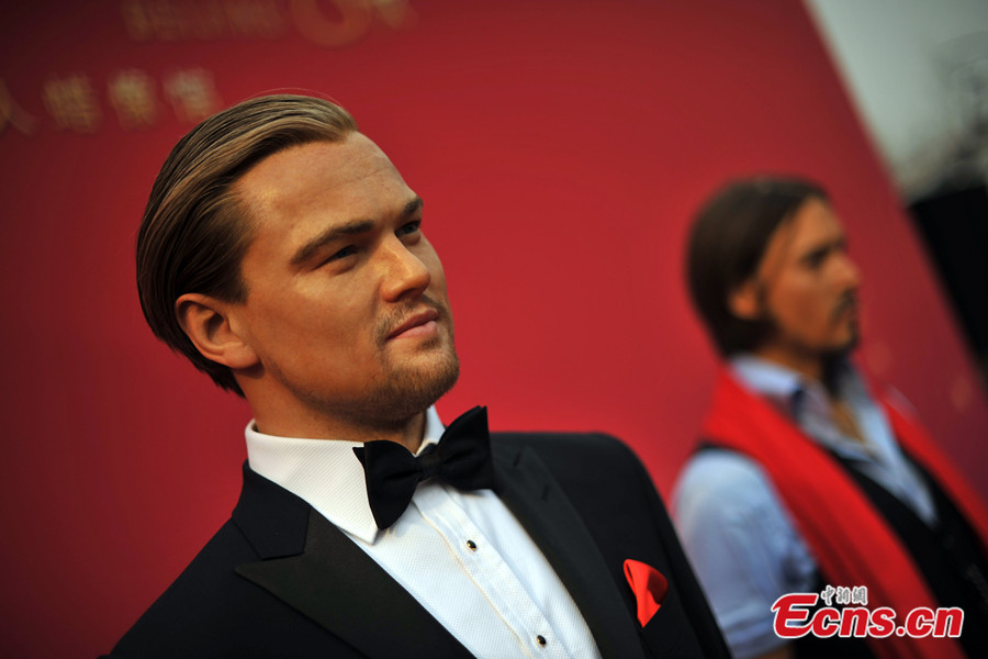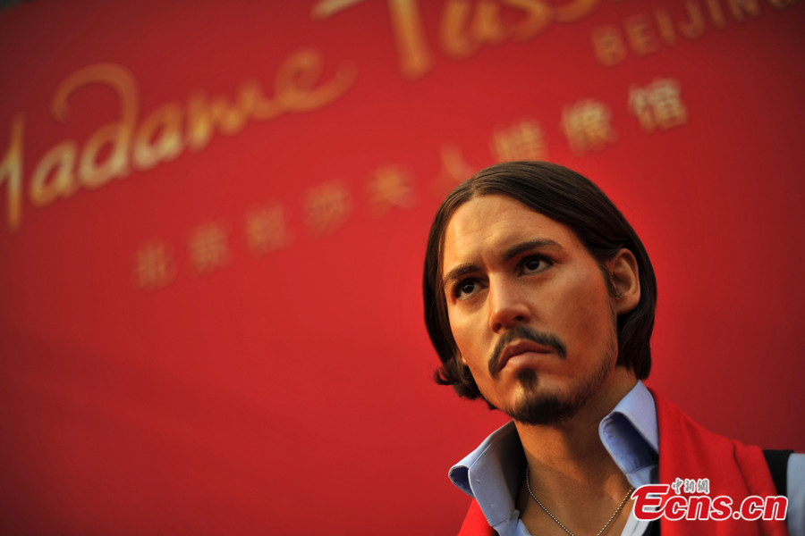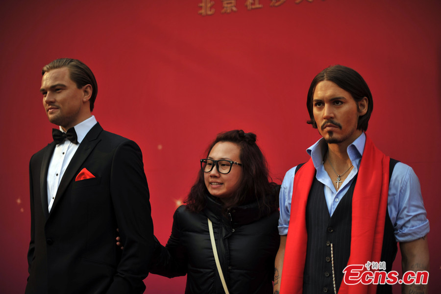 A woman poses for photos with wax figures of Leonardo DiCaprio and Johnny Depp at the unveiling ceremony of Madame Tussauds Beijing at Qianmen Avenue in Beijing on the morning of Jan. 23, 2014. The museum will be opened at the end of May or the beginning of June this year. [Photo: Chinanews.com / Jin Shuo]
