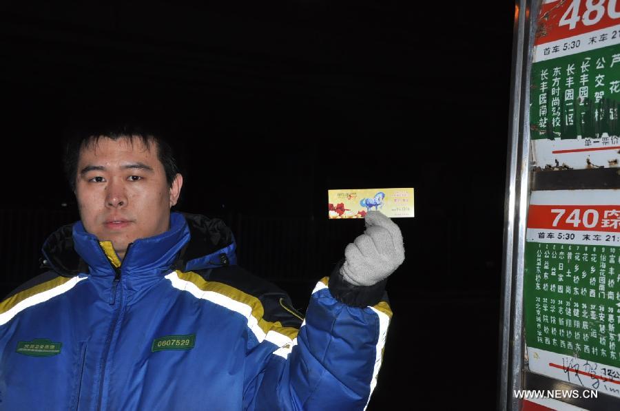 A bus worker shows a memorial bus ticket for the Year of the Horse in Beijing, capital of China, Jan. 23, 2014. Beijing Public Transport Holdings has issued a set of two memorial bus tickets for the Year of the Horse, or the lunar New Year, which begins on Jan. 31. (Xinhua/Wu Guocai)