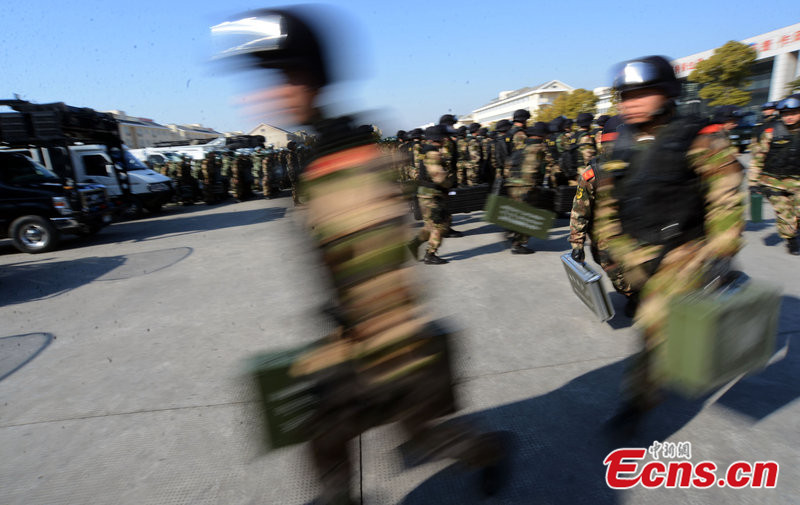 Armed policemen take part in a comprehensive drill, covering emergency dispatch and tactical support, to tighten patrol and inspection efforts during Spring Festival travel rush in Nanjing of east China's Jiangsu province on Jan. 23, 2014. [Photo/CFP]