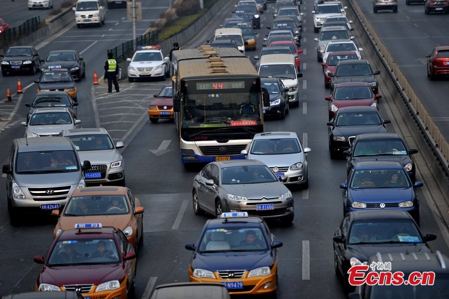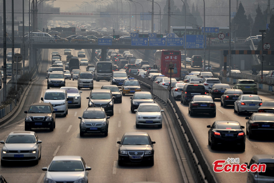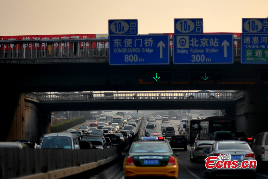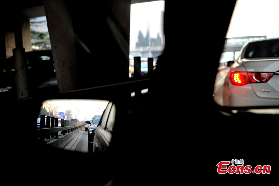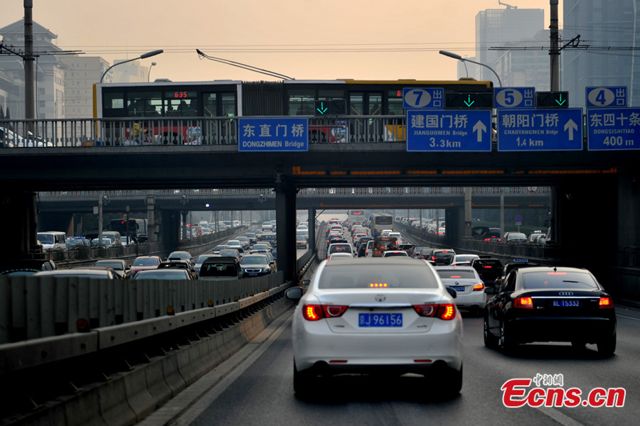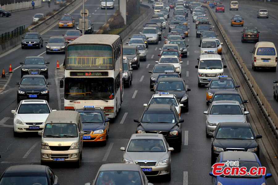 Photo taken on Jan 23, 2014 shows the heavy traffic on a road of Beijing. The city's expressways and road traffic will be tested by heavy vehicle load a week before the 2014 Chinese New Year. [Photo: Chinanews.com / Jin Shuo]