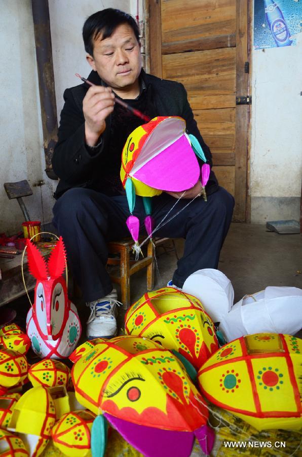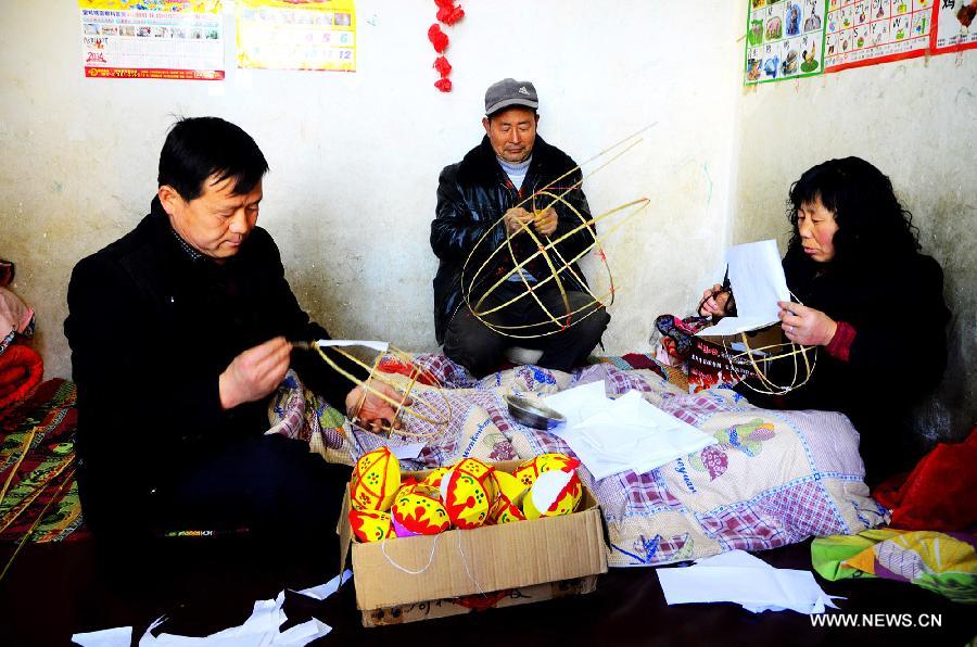 Three artists make festival lanterns at Lengdixia Village in Longxian County, northwest China's Shaanxi province, Jan 23, 2014. Lingdixia Village has a history of 600 years in making lanterns used in the celebration of the Chinese traditional lunar New Year, or Spring Festival, which falls on Jan 31 this year. (Xinhua/Liang Huiping)