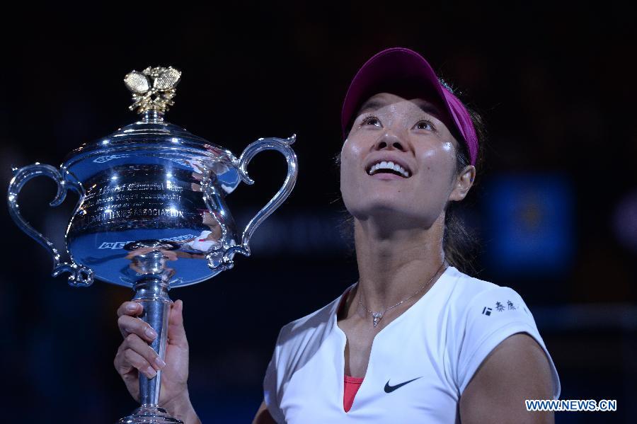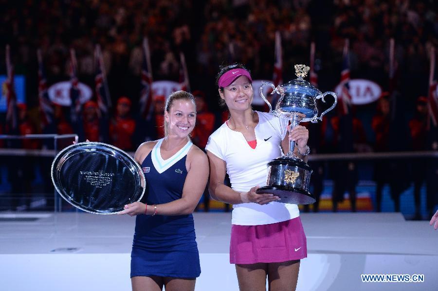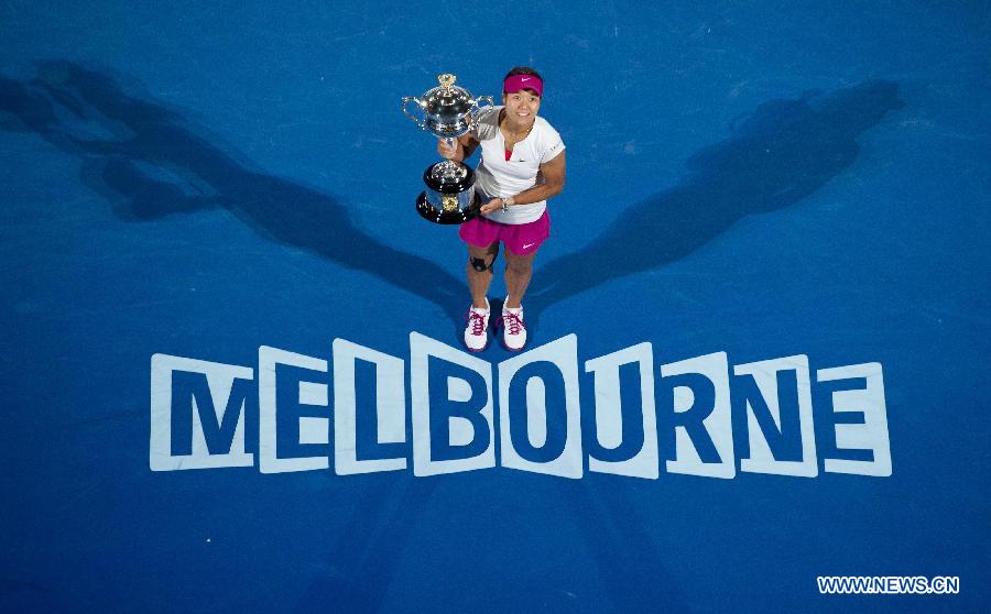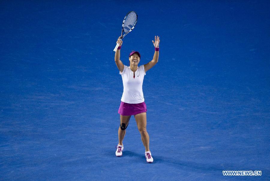 Li Na of China celebrates after winning her women's singles final match against Dominika Cibulkova of Slovakia at 2014 Australian Open tennis tournament in Melbourne, Australia, Jan 25, 2014. Li Na won 2-0 to claim the title of the event. (Xinhua/Bai Xue)