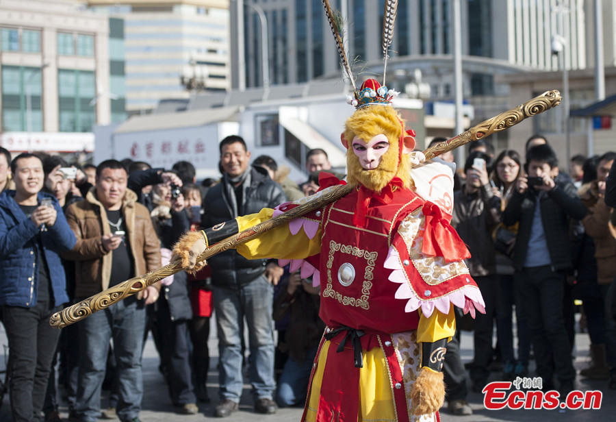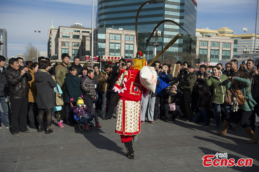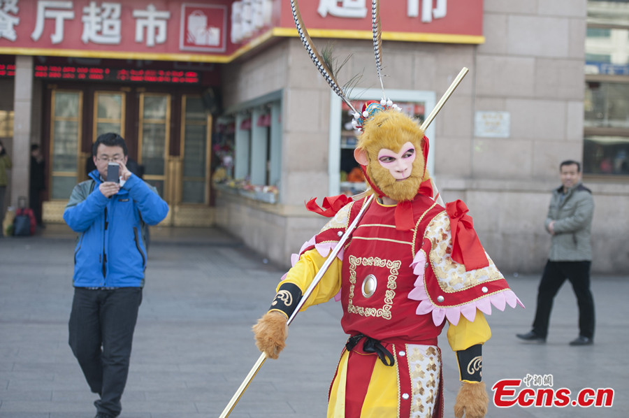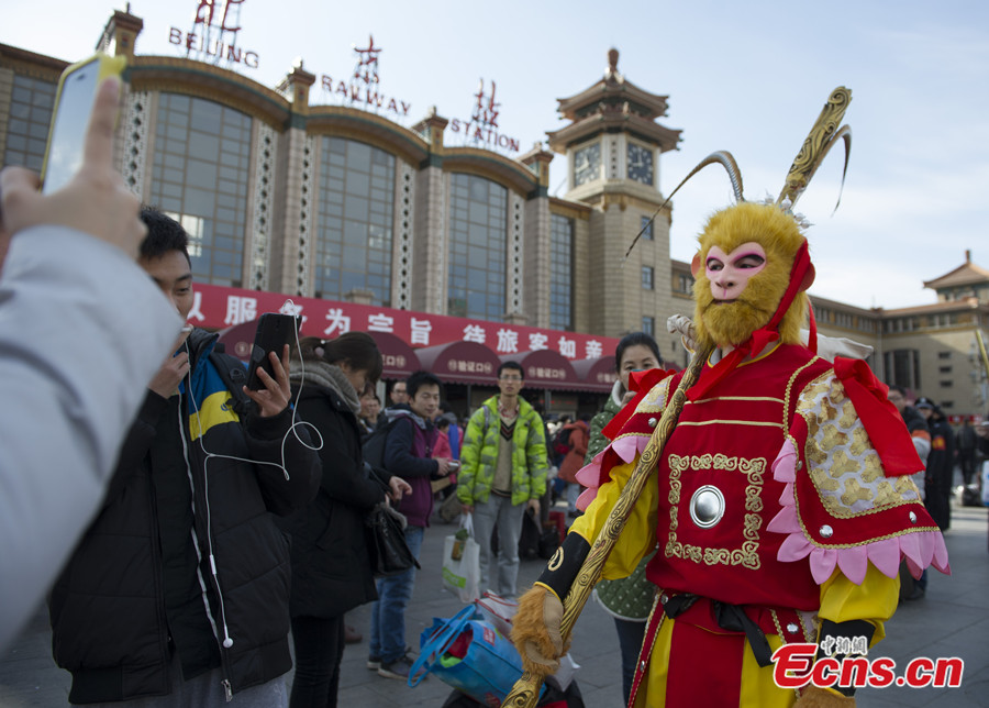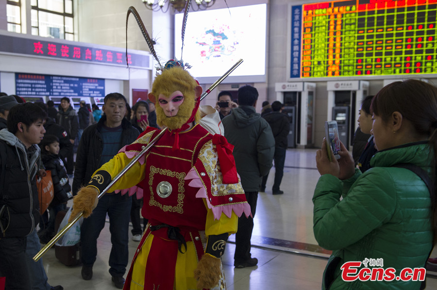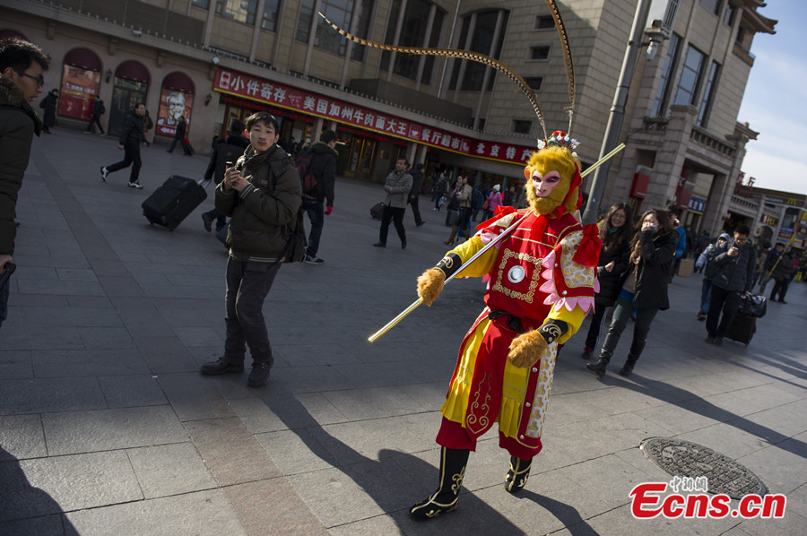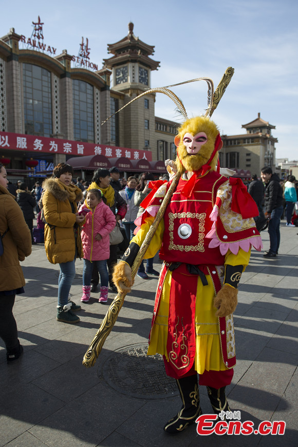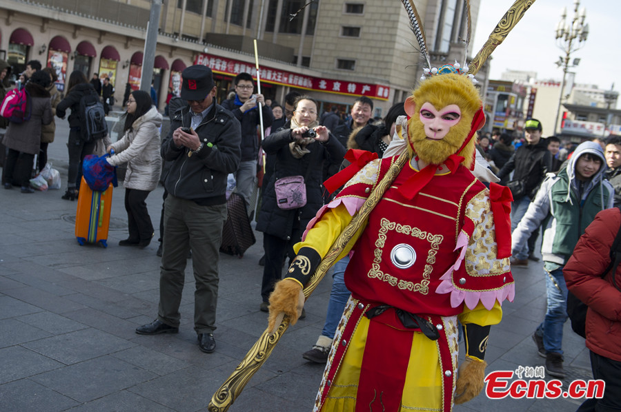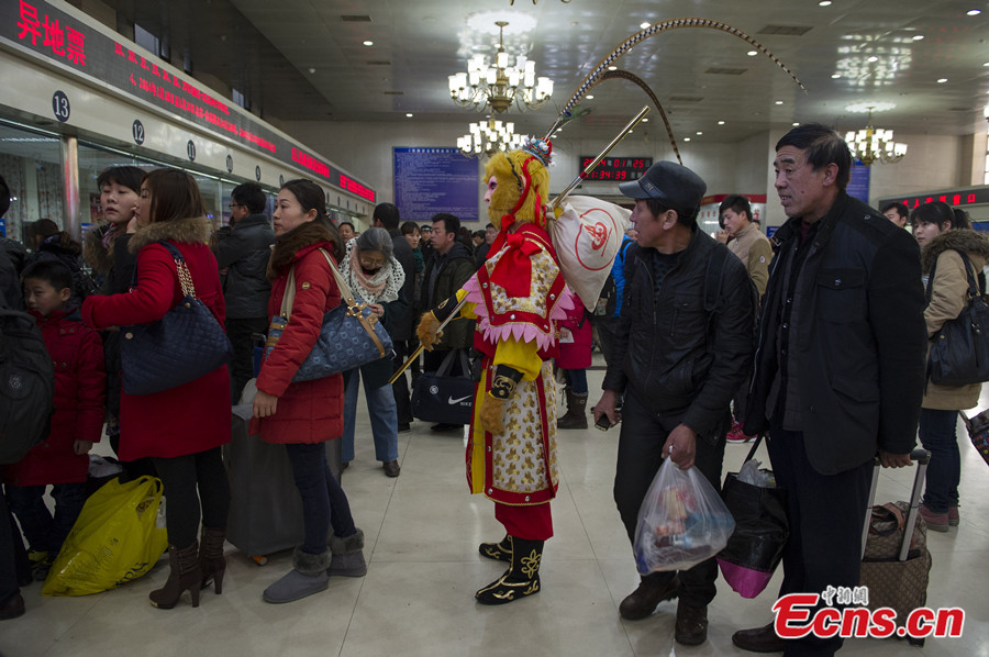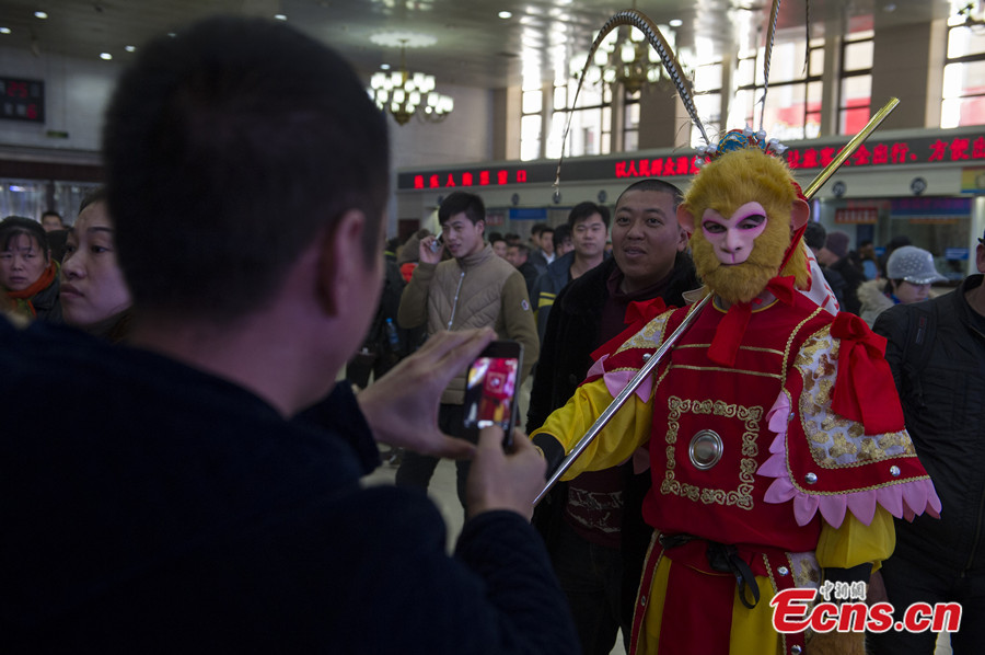 A young man, dresses as Monkey King, is seen at Beijing Railway Station on Jan. 25, 2014. The man, a student of Beijing Film Academy, is here to buy a train ticket to return his hometown in Henan province. [Photo: China News Service / Cui Nan]