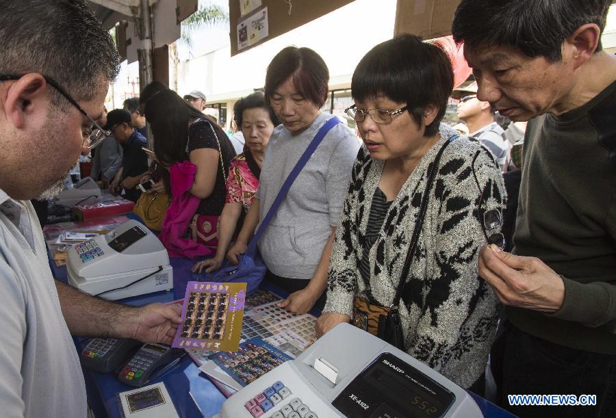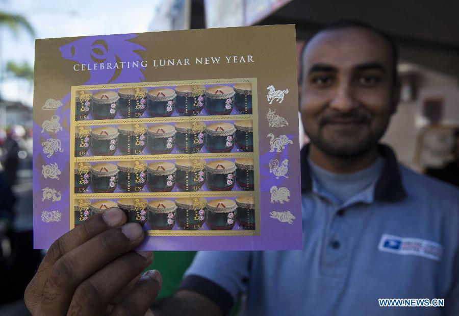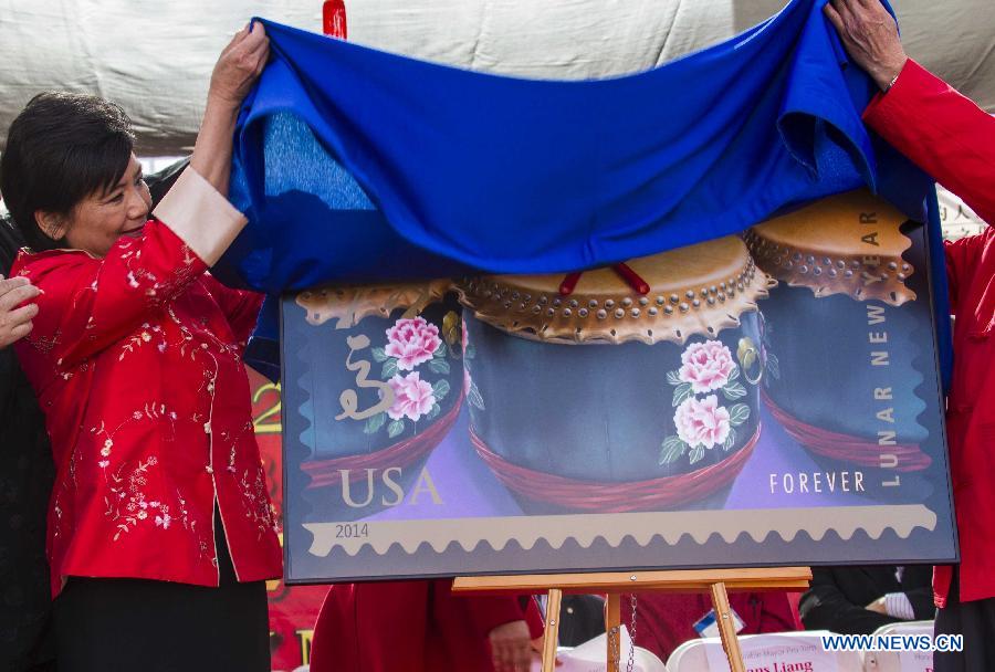 U.S. Congresswoman Judy Chu unveils the "Celebrating Lunar New Year: Year of the Horse" forever stamp during the opening ceremony of the two-day Monterey Park Chinese New Year Festival in Los Angeles Jan. 25, 2014. (Xinhua/Zhao Hanrong)