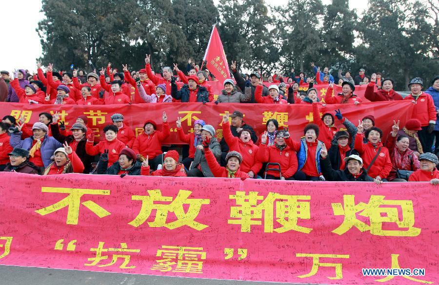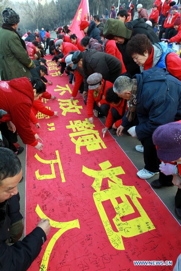 People sign the banner calling for a firework-free Spring Festival in Jinan, capital of east China's Shandong Province, Jan. 25, 2014. The Chinese Spring Festival, or lunar New Year, is traditionally celebrated with fireworks, which cause serious air pollution. A number of Jinan citizens called Saturday on others to stop exploding fireworks during the Spring Festival starting on Jan. 31 this year to protect the environment. (Xinhua/Lyu Chuanquan)