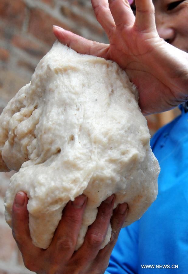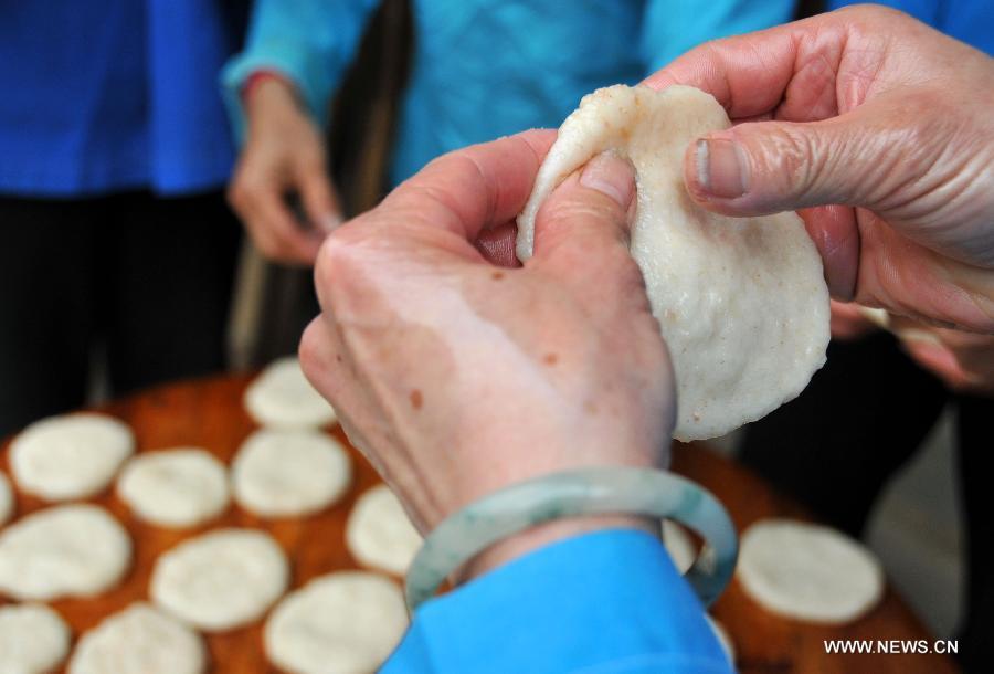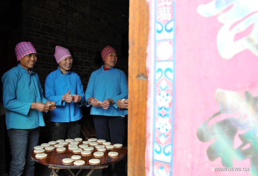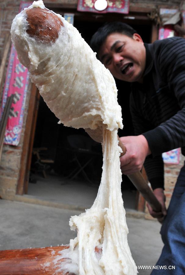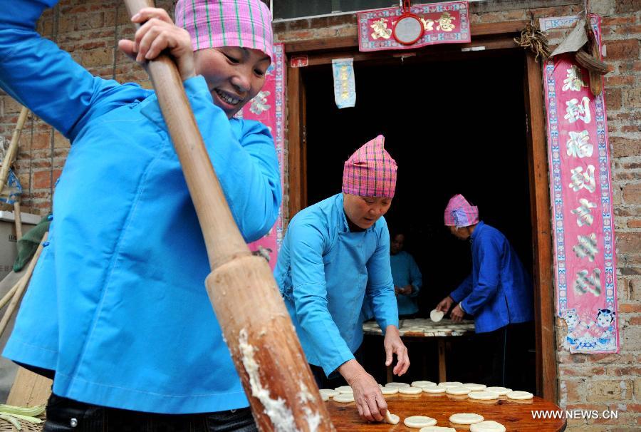 Women of Yao ethnic group make "ciba", a special glutinous rice cake, in Luoshan Village, Lianshan Township, Fuchuan Yao Autonomous County, south China's Guangxi Zhuang Autonomous Region, Jan. 26, 2014. Yao people in Fuchuan have the tradition of making ciba for the Spring Festival and harvest celebration. (Xinhua/Chen Zixia)