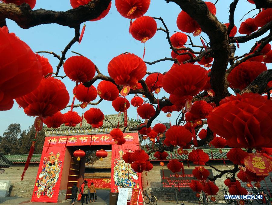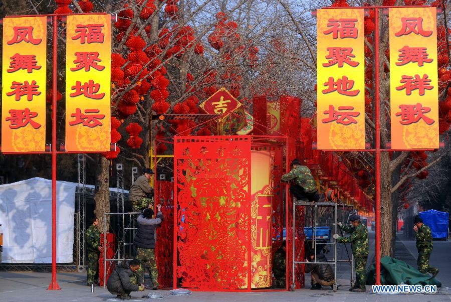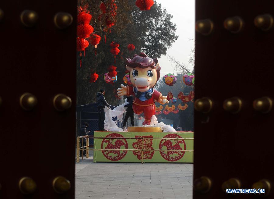 People visit the Ditan Park decorated with lanterns for an upcoming temple fair in Beijing, capital of China, Jan 27, 2014. The fair will be held from Jan 30 to Feb 6. (Xinhua/Gong Lei)