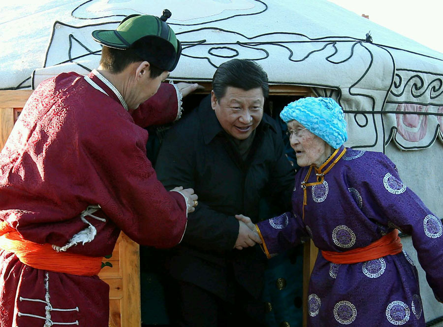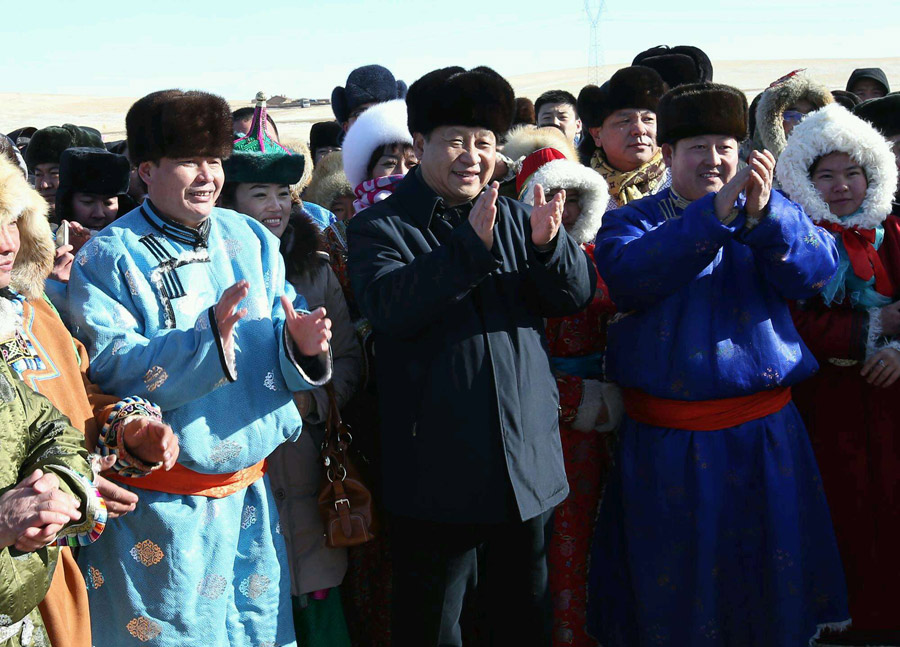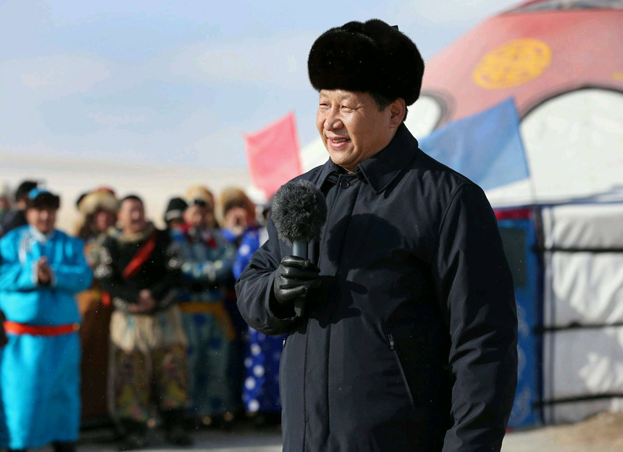Chinese President Xi Jinping attends the winter Naadam fair and sends holiday greetings to local people in Xinlin Gol of North China's Inner Mongolia autonomous region on Jan. 27, 2014. [Photo/Xinhua]