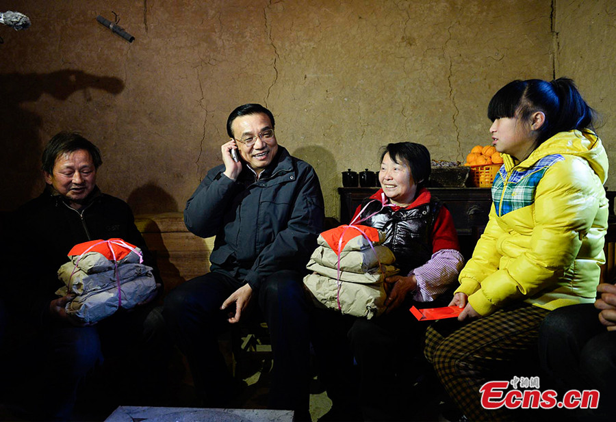 Chinese Premier Li Keqiang visits Jinpo village of Xunyang county in Ankang city of northwest China's Shaanxi province on Jan. 27, 2014. He delivered holiday greetings to local left-behind children. [Photo/Zhang Zhen]
