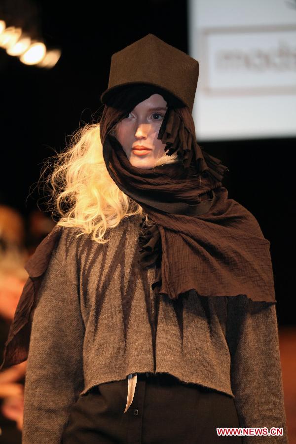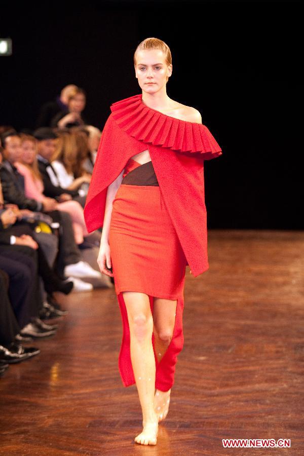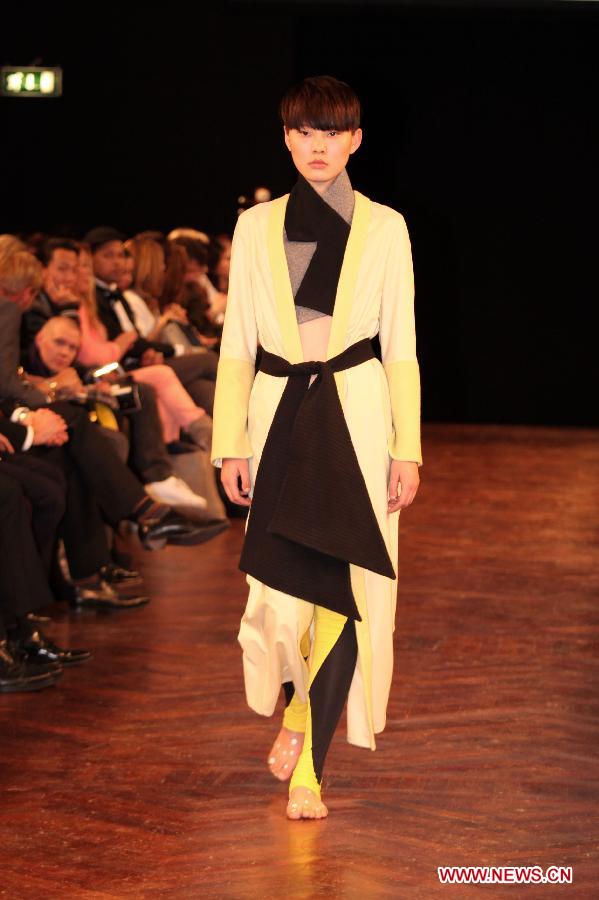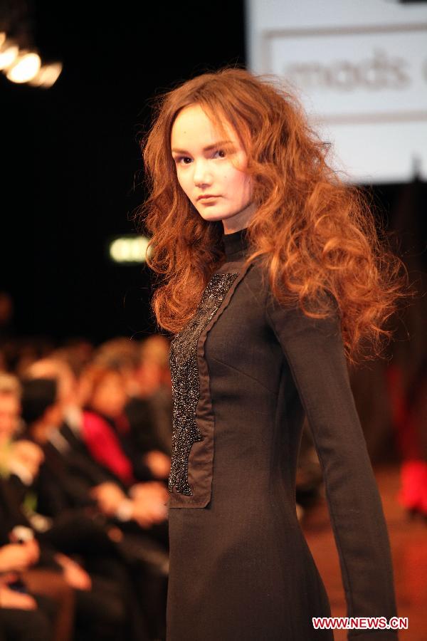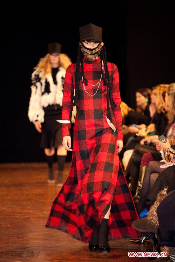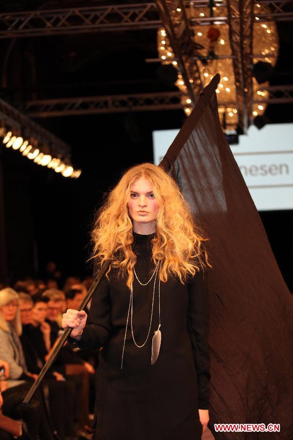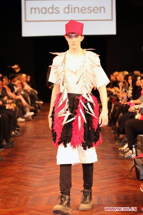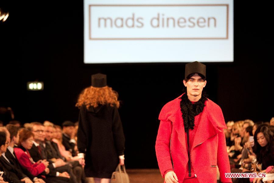 A model presents a creation of Danish designer Mads Dinesen during "Chinese New Year" fashion show in Copenhagen, Denmark, Jan 28, 2014. (Xinhua/Wu Bo)