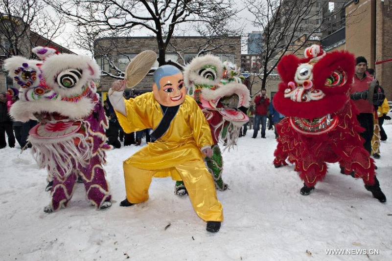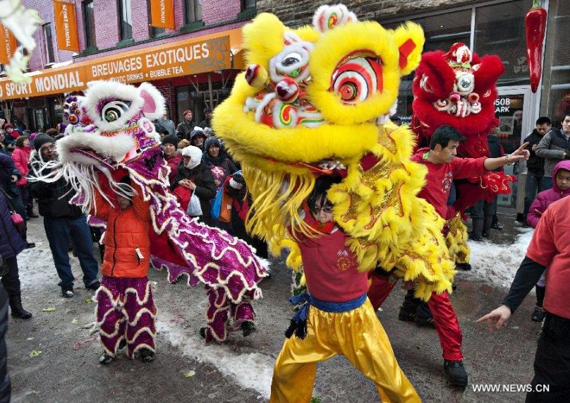 Chinese Canadian celebrate the Chinese new year with lion dancing in Montreal' s Chinatown on Feb. 3, 2014. The event is sponsored annually by the Montreal Chinese Chamber of Commerce and performed by the Montreal Chinese Lion Dance Club. (Xinhua/Andrew Soong)