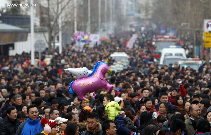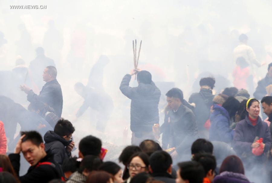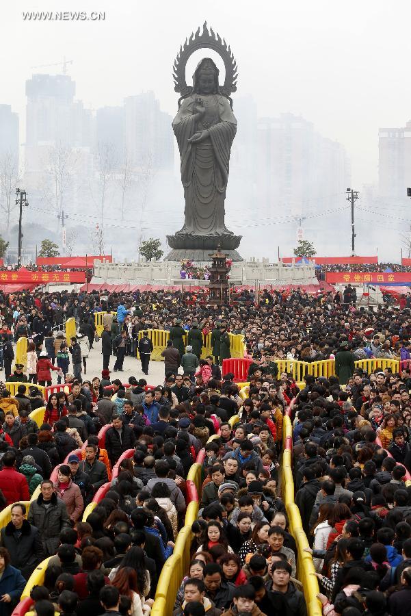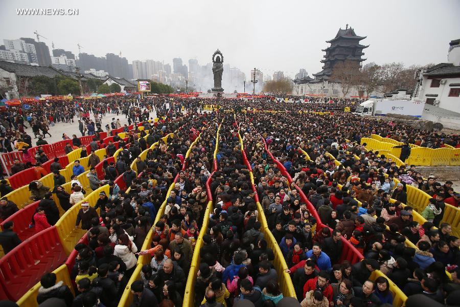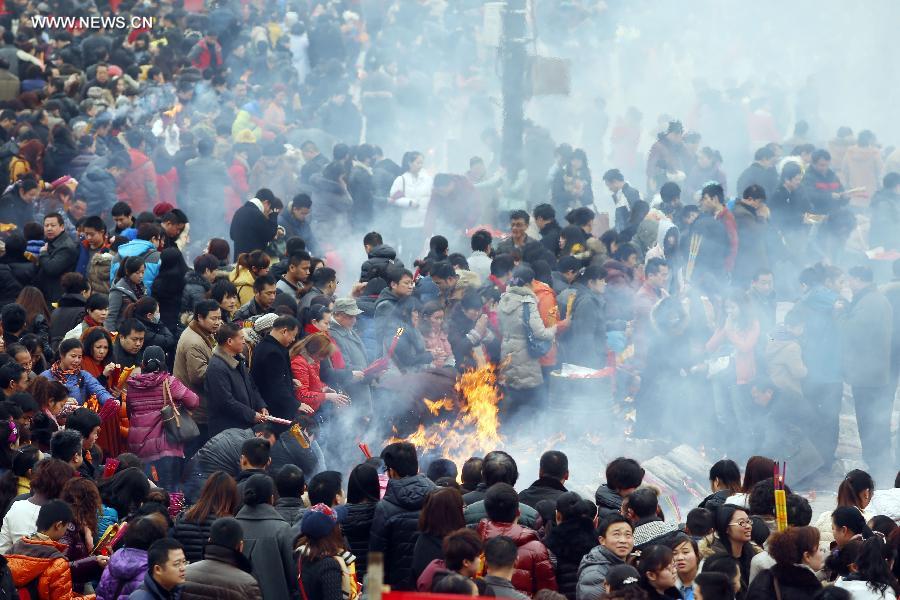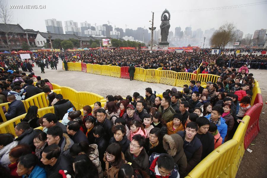 People head for the Guiyuan Temple to worship the God of Wealth in Chinese mythology in Wuhan, capital of central China's Hubei Province, Feb. 4, 2014. Hundreds of thousands of people on Tuesday visited the Guiyuan Temple to pray for fortune, on the birthday of the God of Wealth, which is considered to be the fifth day of the Chinese lunar New Year and falls on Feb. 4 this year. (Xinhua)