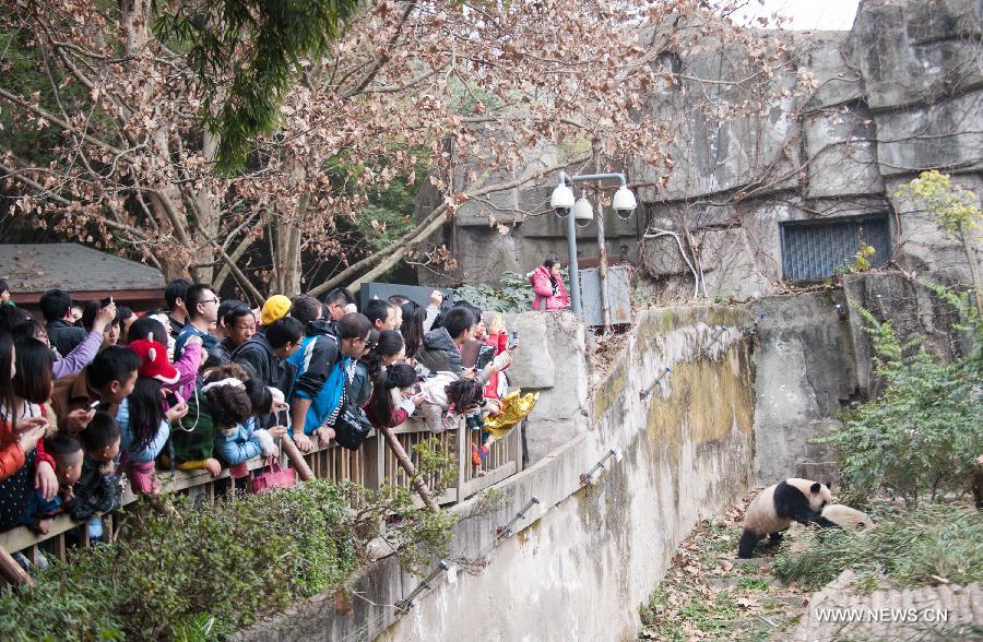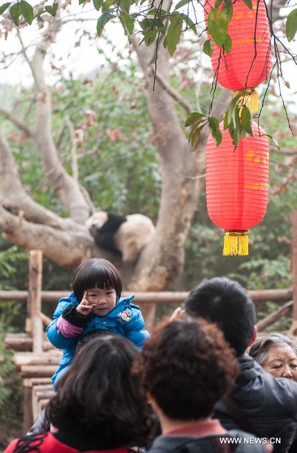 A giant panda cub is seen at the Chengdu giant panda breeding and research base in Chengdu, capital of southwest China's Sichuan Province, Feb. 3, 2014. A giant panda-themed carnival was held at the base during the Spring Festival. (Xinhua/Xue Yubin)
