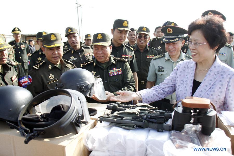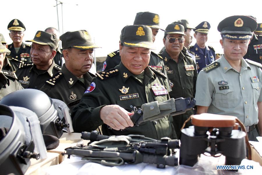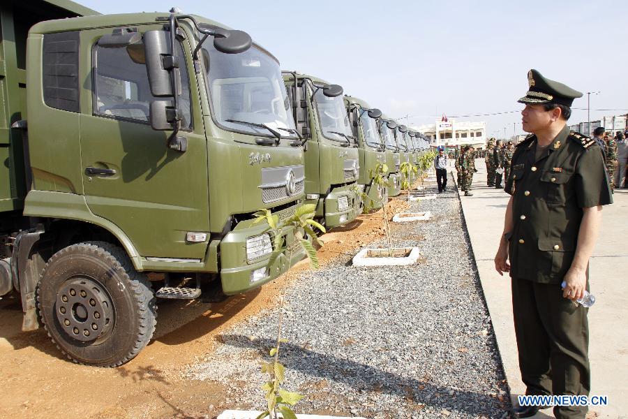 Chinese Ambassador to Cambodia Bu Jianguo (R) inspects China-donated military trucks in Phnom Penh, Cambodia, Feb 7, 2014. China on Friday delivered 26 military trucks and 30,000 military uniforms to Cambodia. (Xinhua/Sovannara)