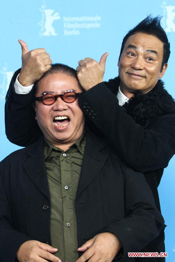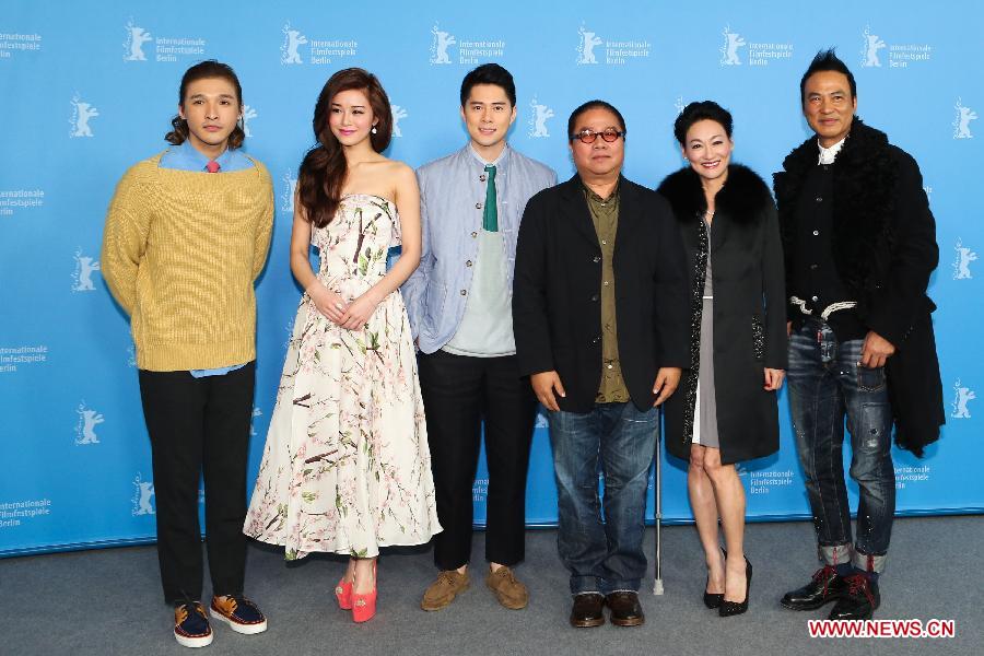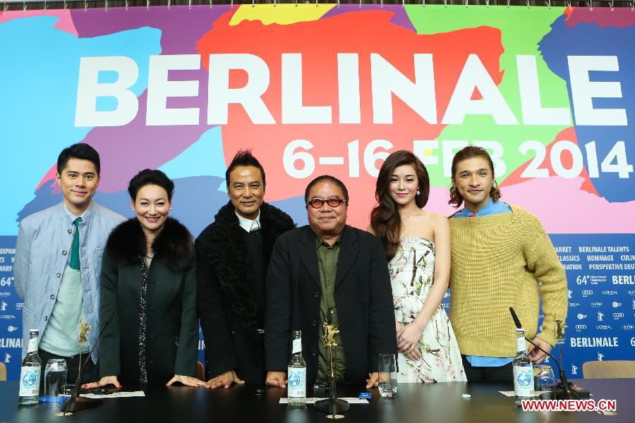 You-Nam Wong, Janice Man, Chui Tien-You, Fruit Chan, Kara Hui Ying-hung and Simon Yam (L to R) pose for photos at a photocall as they promote "The Midnight After", a new movie directed by Fruit Chan, during the 64th Berlinale International Film Festival in Berlin, Germany, on Feb. 7, 2014. (Xinhua/Zhang Fan)