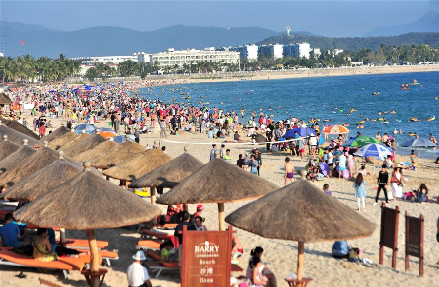 Photo taken on Jan.31, 2014 shows tourists posing for photos at a beach in Sanya City, South China's Hainan province. The gross income of Sanya's tourism during the week-long Spring Festival holiday reached 5.464 billion yuan this year, up 25.31% from last year. [Photo/Xinhua]