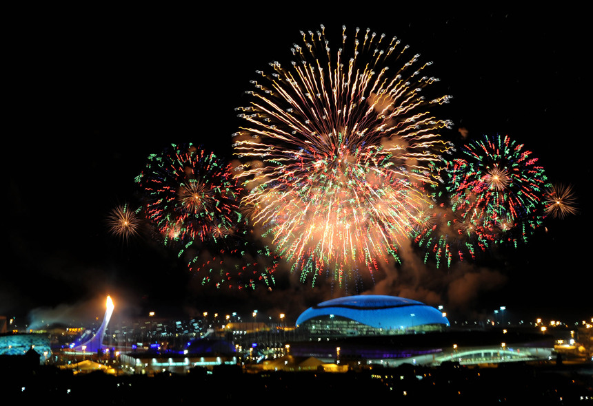 Fireworks go off over the Olympic Park at the end of the Opening Ceremony of the Sochi 2014 Olympic Games at the Fisht Olympic Stadium, Sochi, Russia, February 7, 2014. [Photo/Xinhua]