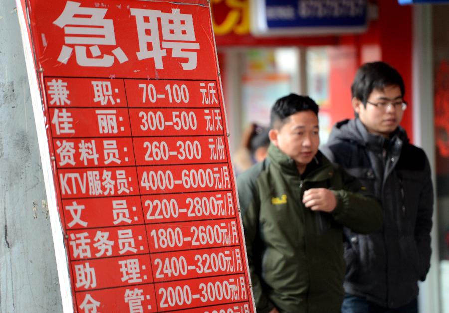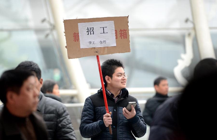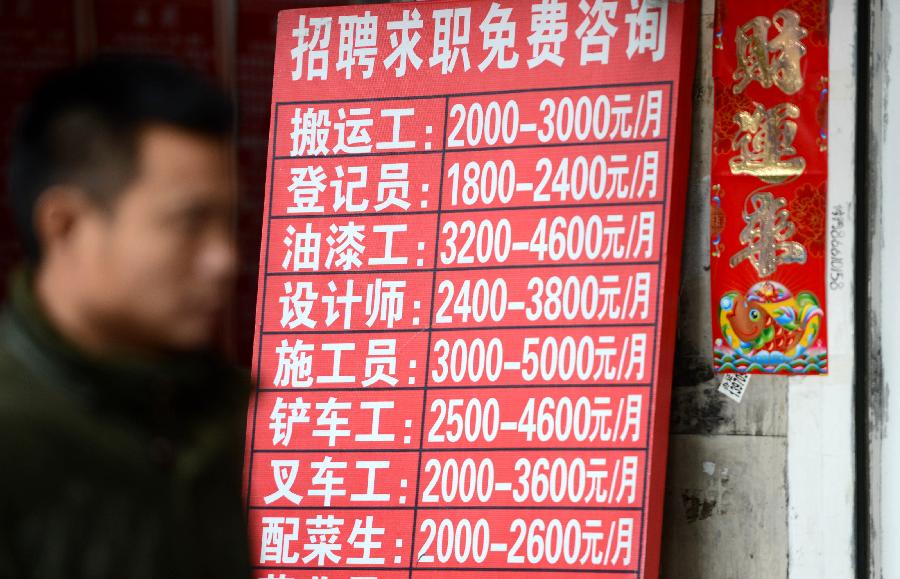 A board with recruitment information is set up near the Nanchang Railway Station in Nanchan, capital of east China's Jiangxi province, Feb 8, 2014. Recruiting information could be seen around the railway station during the passenger flow return peak. Migrant workers started to go back to major cities and seek jobs after the week-long lunar new year holiday. (Xinhua/Zhou Ke)