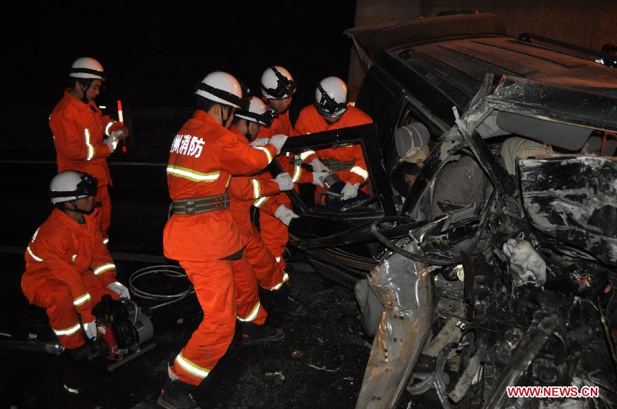 Rescuers work at a traffic accident site on the Shanghai-Kunming Expressway in Jianhe County, southwest China's Guizhou province, Feb 9, 2014. Seven people were killed and three others injured in the accident. (Xinhua)