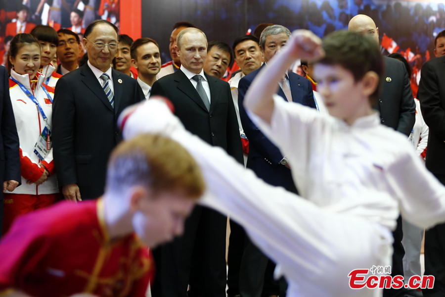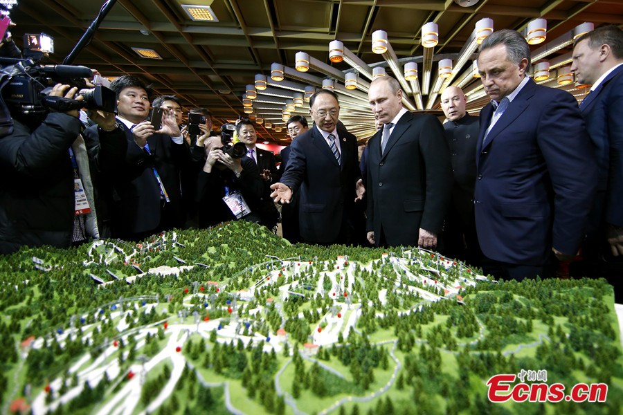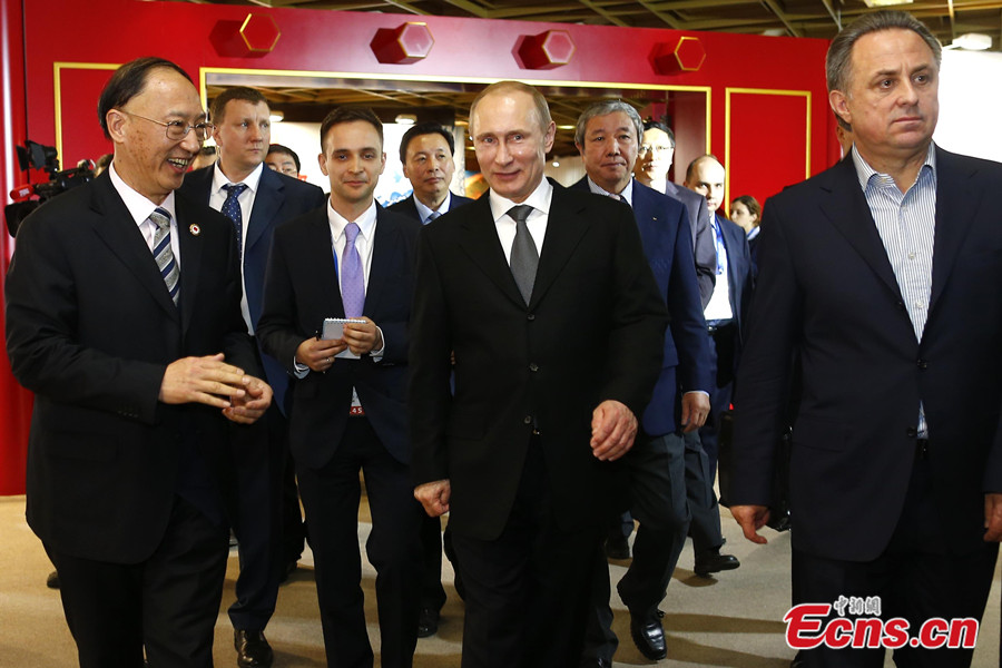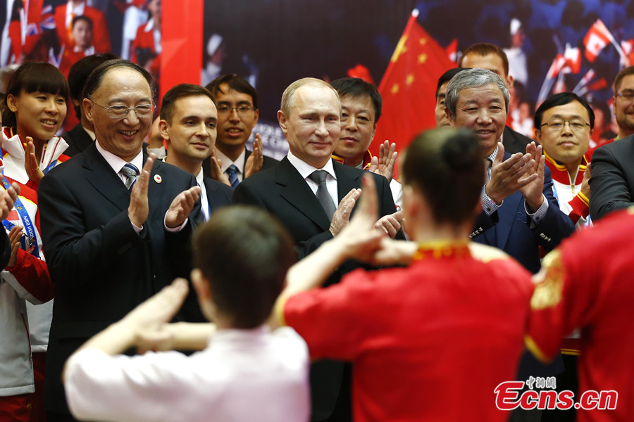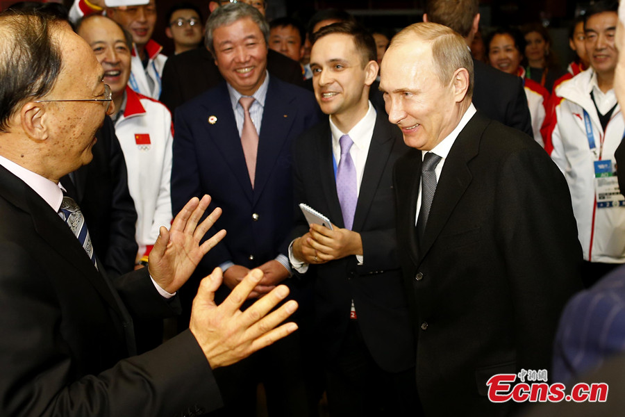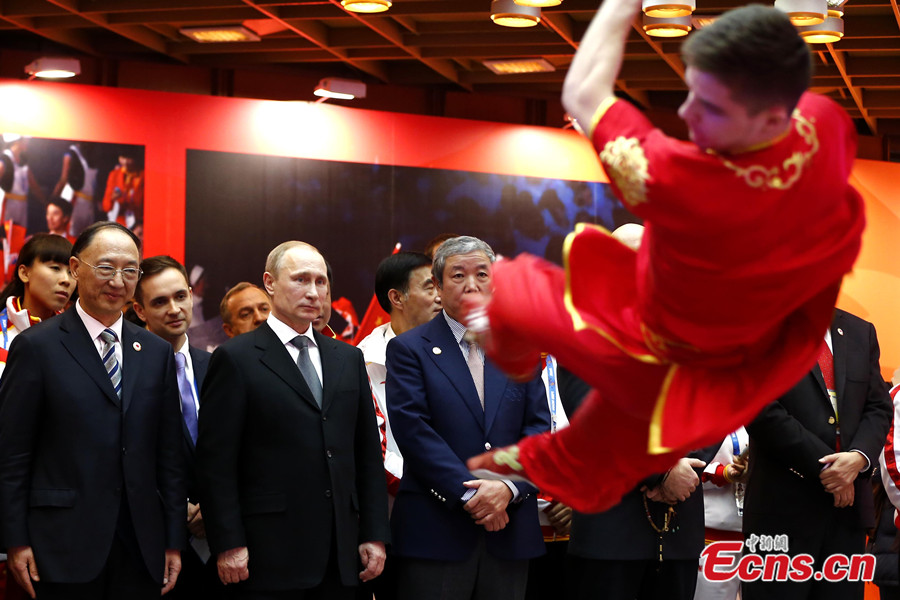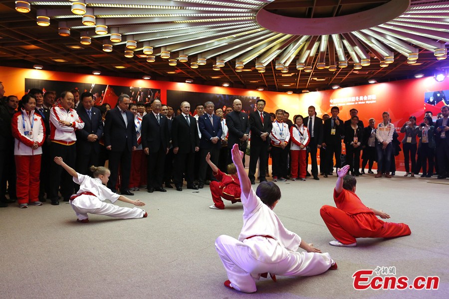 Russian president Vladimir Putin visits China House at the Sochi Winter Olympic Games on February 10, 2014. The China House, located on the second floor of Zhemchuzhina hotel on the Black Sea coast, functions as a reception center as well as a showcase of Chinese culture and sport achievements during the Sochi Olympics.[Photo: China News Service / Fu Tian]