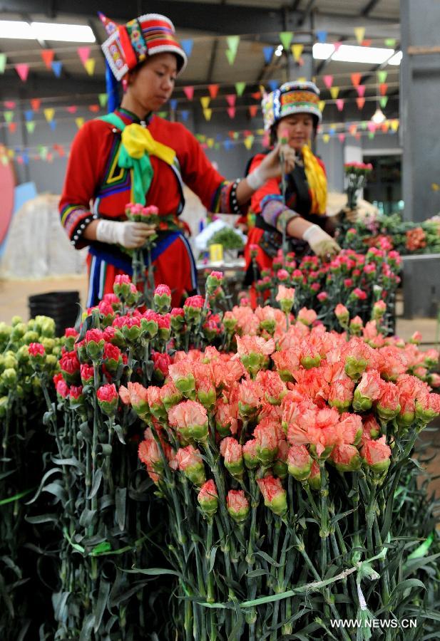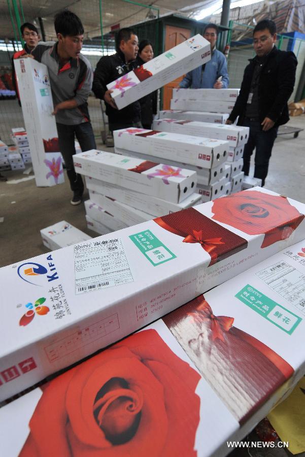 Roses are stacked at a fresh flower market in Kunming, southwest China's Yunnan Province, Feb. 11, 2014. As the Valentine's Day and Chinese traditional lantern festival draw near, large quantities of fresh flowers were put into market in Yunnan, China's fresh flower production and export base. Currently, Yunnan turns out over seven billion flowers a year, yielding an output value exceeding 30 billion yuan (4.95 billion US dollars). (Xinhua/Lin Yiguang)