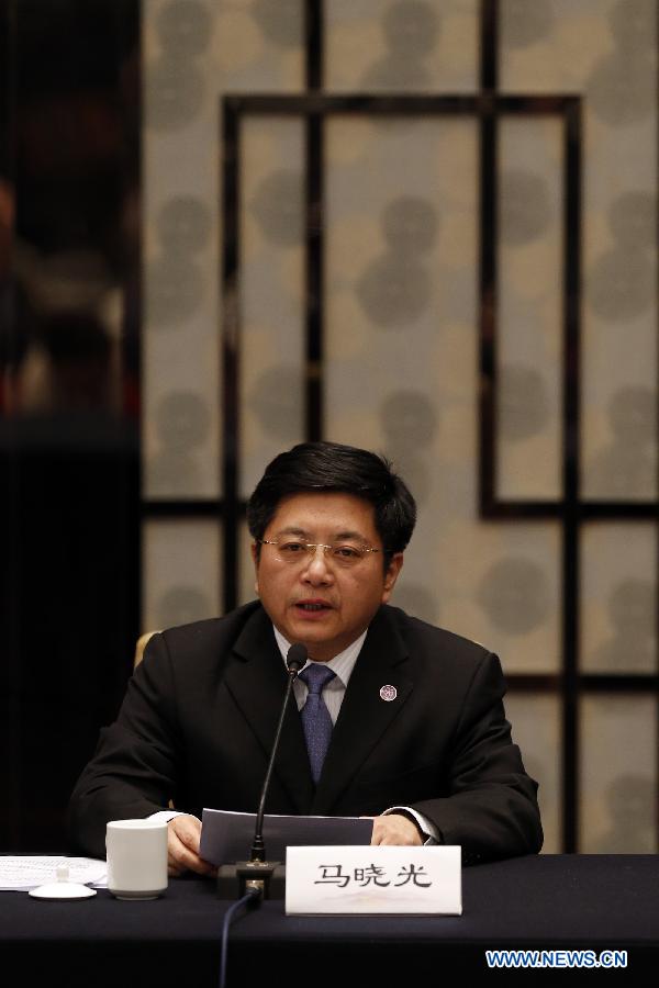 Ma Xiaoguang (L), spokesman of the State Council Taiwan Affairs Office, attends a press conference in Nanjing, capital of east China's Jiangsu Province, Feb. 11, 2014. The Chinese mainland and Taiwan's chief officials in charge of cross-Straits affairs met here on Feb. 11 afternoon for the first time since 1949. The two sides agreed to push forwards the talks on follow-up agreements of the Economic Cooperation Framework Agreement (ECFA). (Xinhua/Shen Peng)