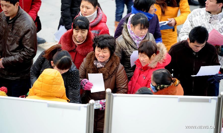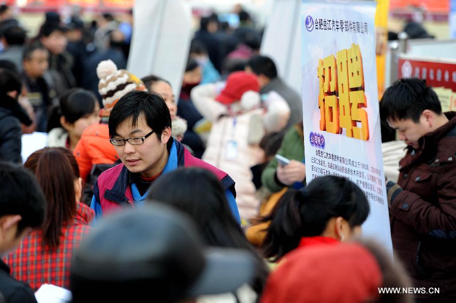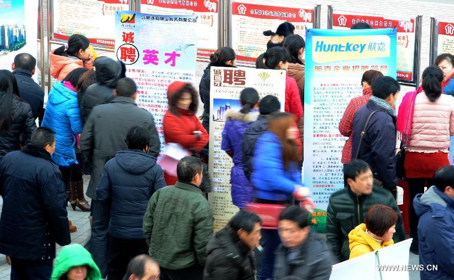 Job seekers look at information boards during a job fair in Hefei, capital of east China's Anhui Province, Feb. 11, 2014. More than 9,000 positions were provided at a job fair held by local government in Hefei Tuesday. (Xinhua/Liu Junxi)