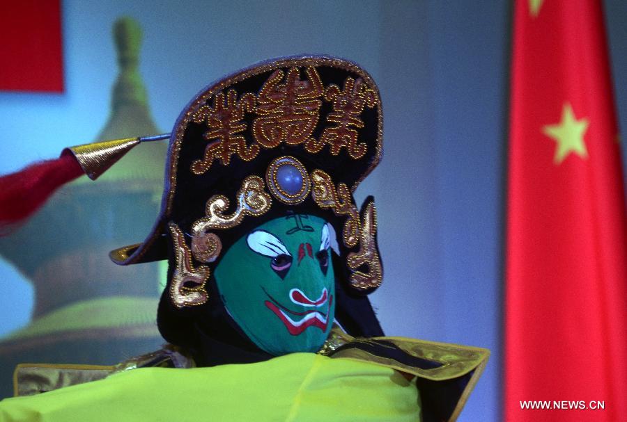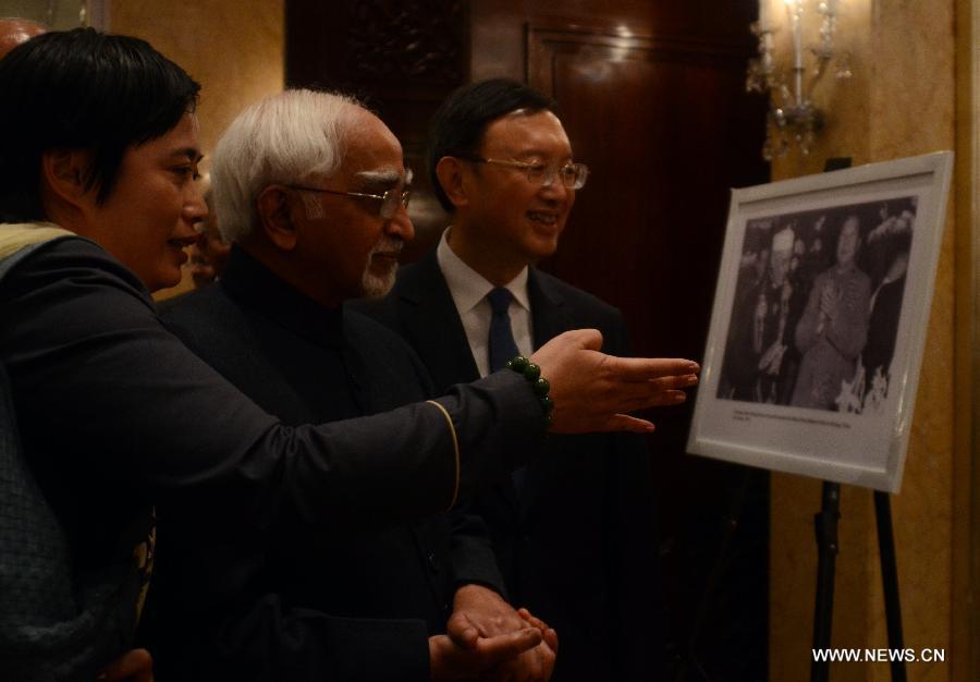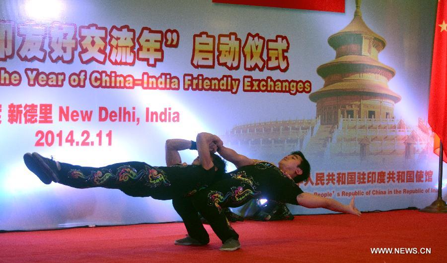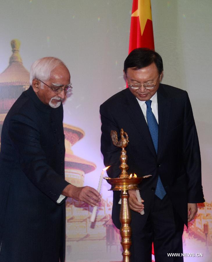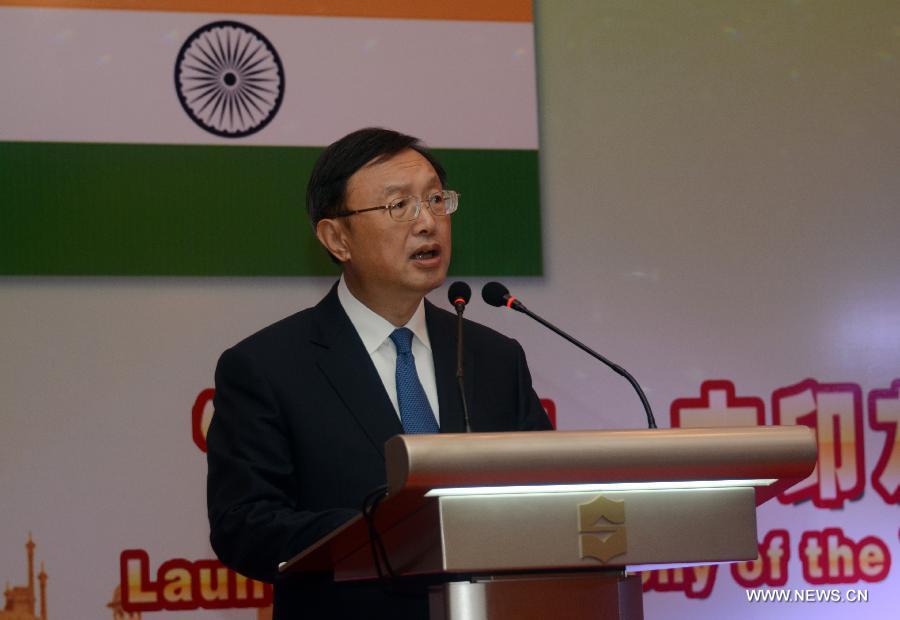 Chinese State Councilor Yang Jiechi addresses the launching ceremony of the Year of China-India Friendly Exchanges in New Delhi, India, Feb 11, 2014. Yang Jiechi and Indian Vice President Mohammad Hamid Ansari on Tuesday launched the Year of China-India Friendly Exchanges. (Xinhua/Partha Sarkar)