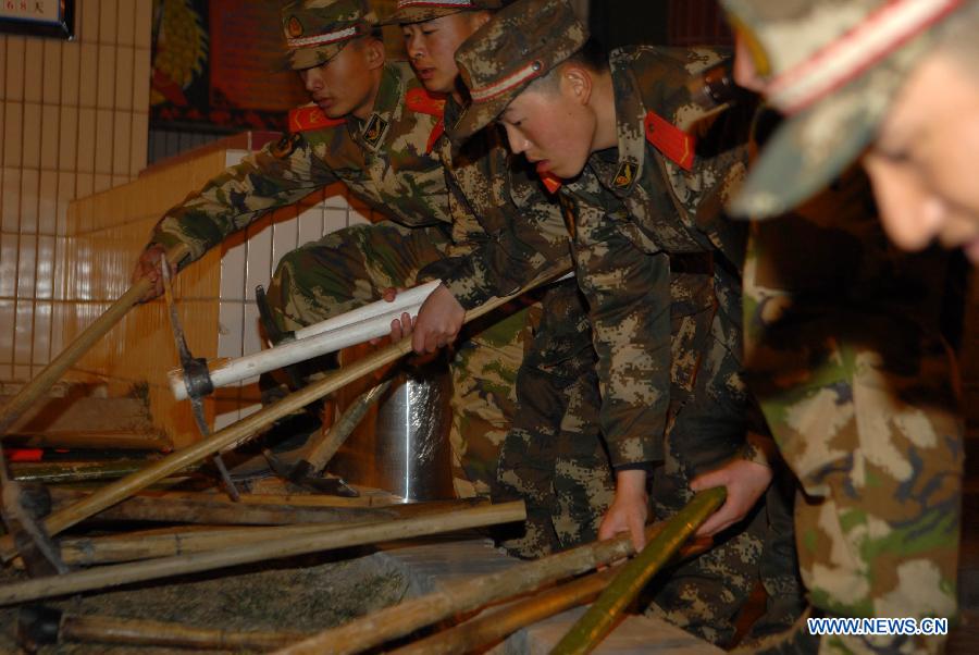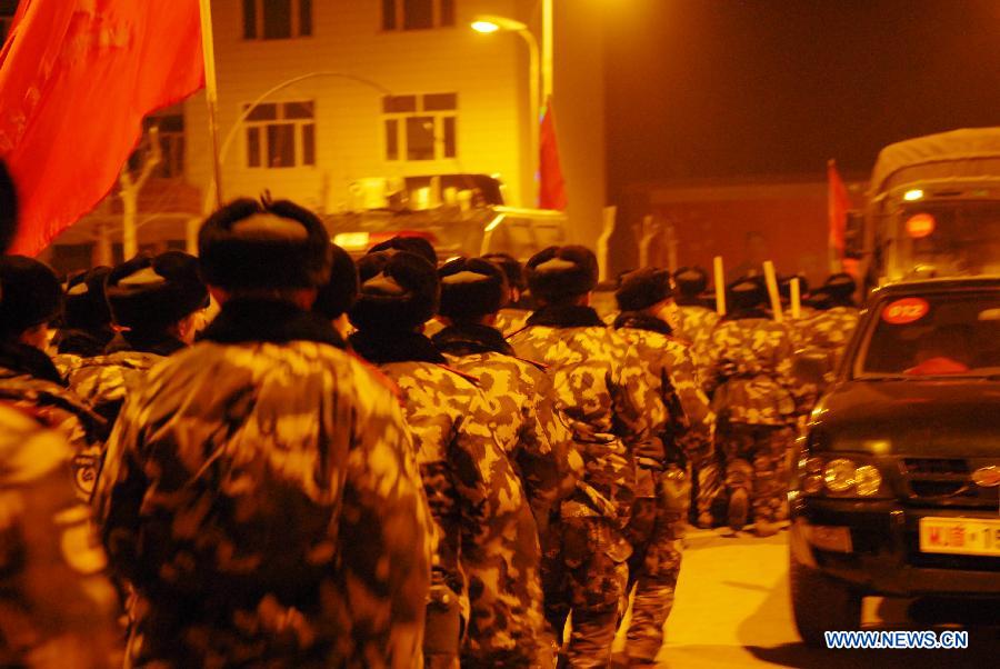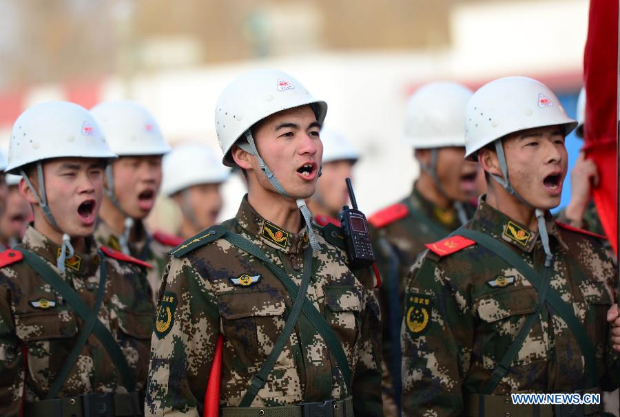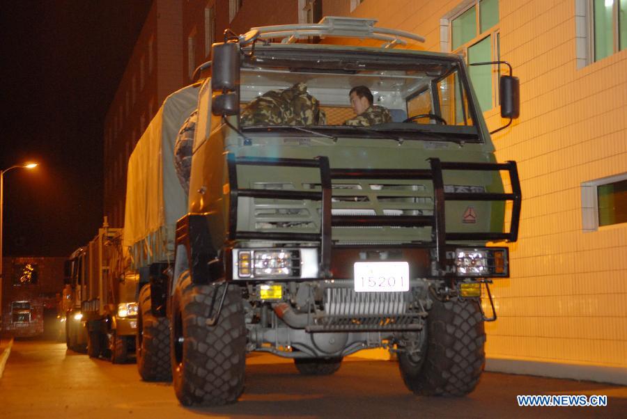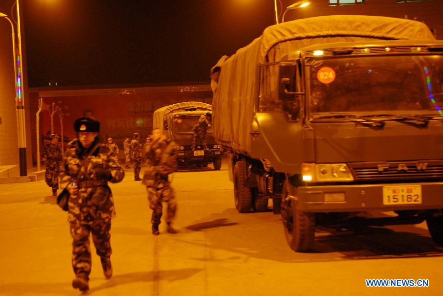 Soldiers stand by before heading for disaster areas in Hotan, northwest China's Xinjiang Uygur Autonomous Region, Feb. 12, 2014. A 7.3-magnitude earthquake struck Yutian County in the prefecture of Hotan at 17:19 p.m., according to the China Earthquake Networks Center. As of 7 p.m., no casualties had been reported. (Xinhua/Zhou Mi)