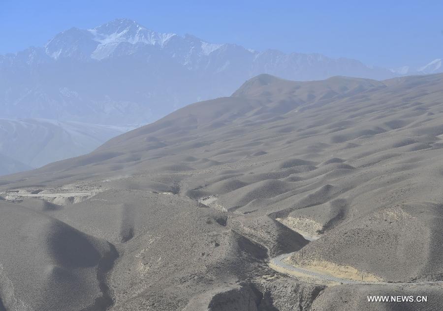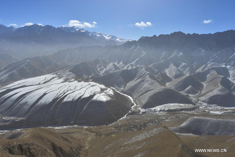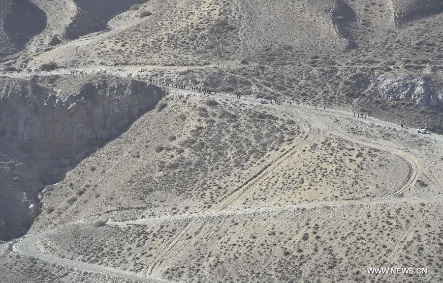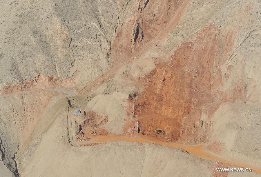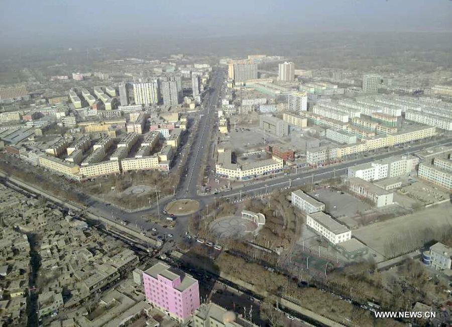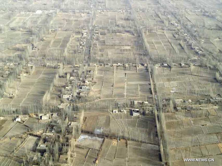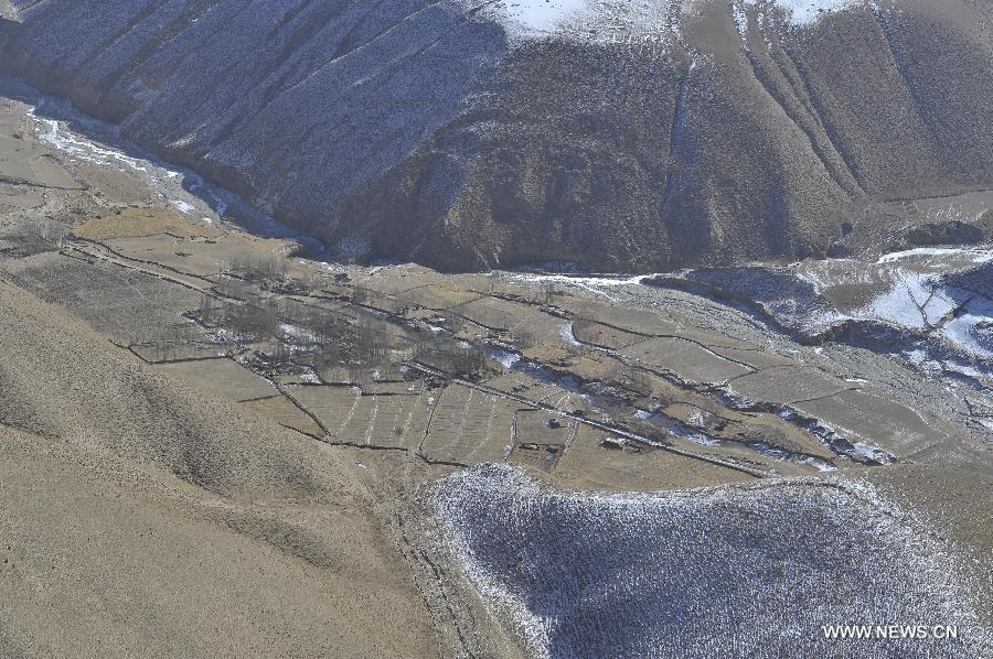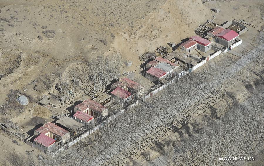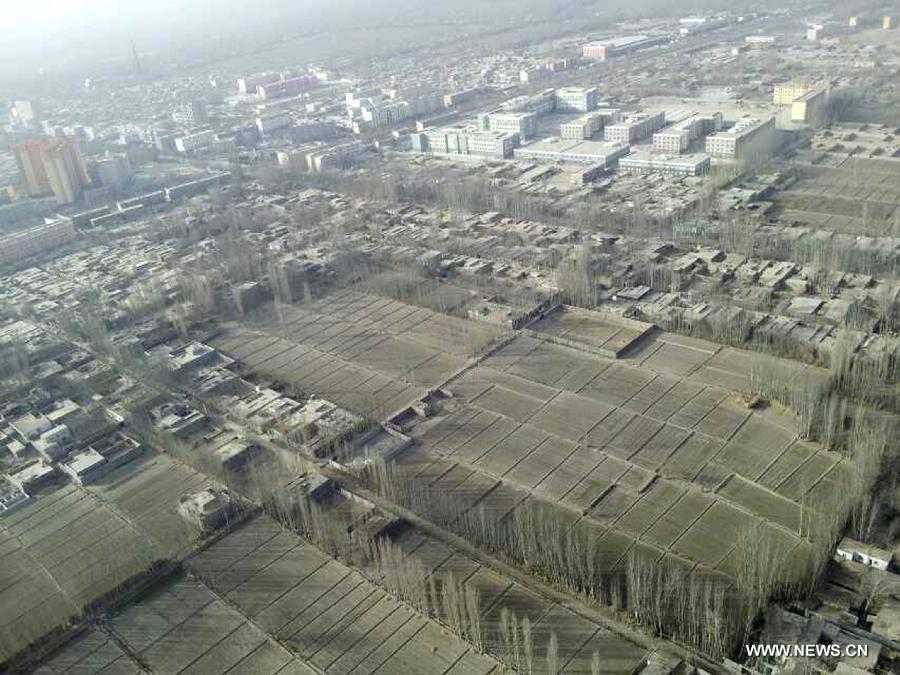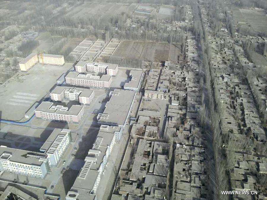 The bird eye view photo taken on a helicopter shows the quake-hit county seat of Yutian, northwest China's Xinjiang Uygur Autonomous Region, Feb. 13, 2014. A 7.3-magnitude earthquake struck Yutian County on Wednesday. By noon of Thursday, 7,838 residents in six counties of Hotan Prefecture, including Yutian, were affected by the tremor, with 982 relocated to safety, said a statement from the regional civil affairs department. So far, no casualties have been reported. (Xinhua/Li Xiang)