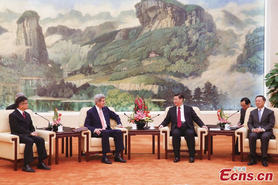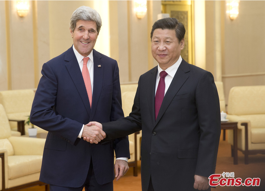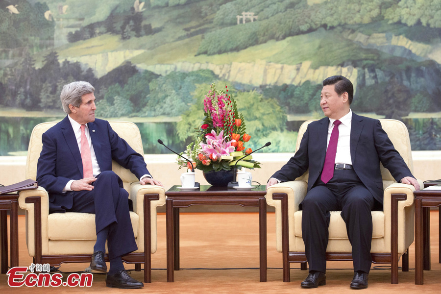 Chinese President Xi Jinping meets with US Secretary of State John Kerry at the Great Hall of the People in Beijing on Feb 14, 2014. (Photo: China News Service / Sheng Jiapeng)