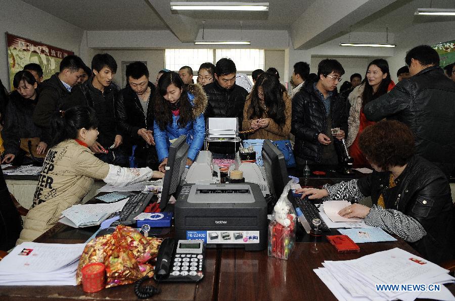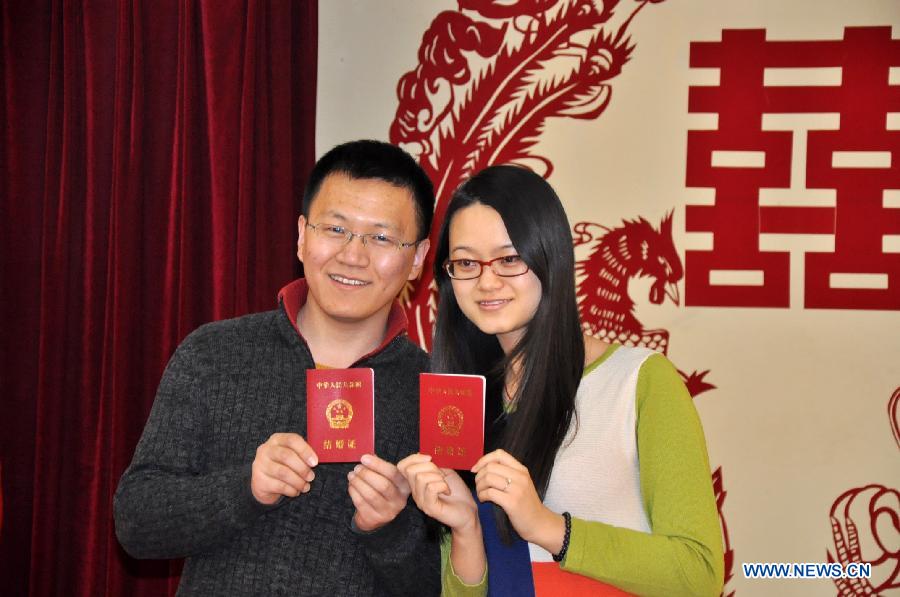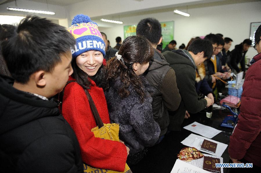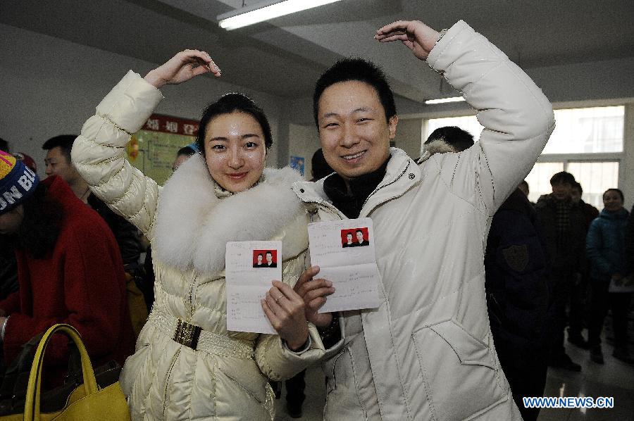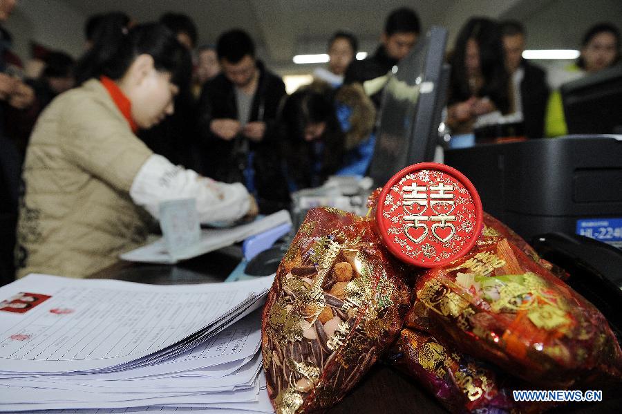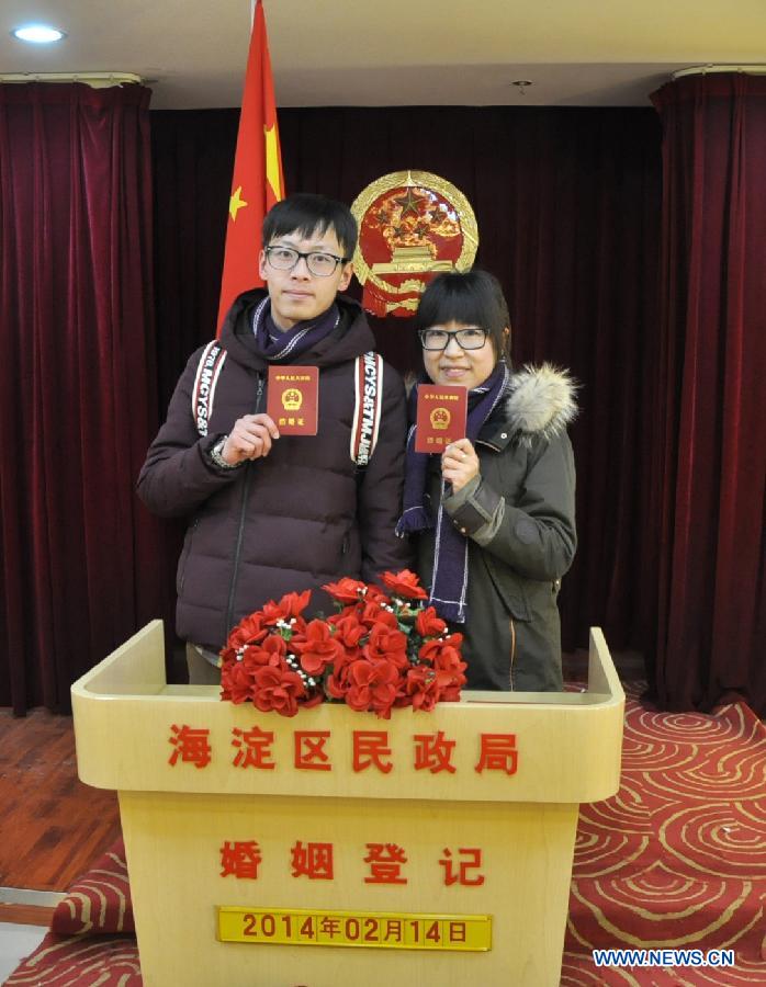 Lovers queue to wait for marriage registration at a marriage registry on the Valentine's Day as well as the Chinese traditional Lantern Festival in Yinchuan, capital of northwest China's Ningxia Hui Autonomous Region, Feb 14, 2014. The registry here is expected to issue more than 300 certificates, three times more than the other days, on the Valentine's Day, which coincides with the Lantern Festival, the 15th day of the first month of the Chinese lunar calendar. (Xinhua/Li Ran)