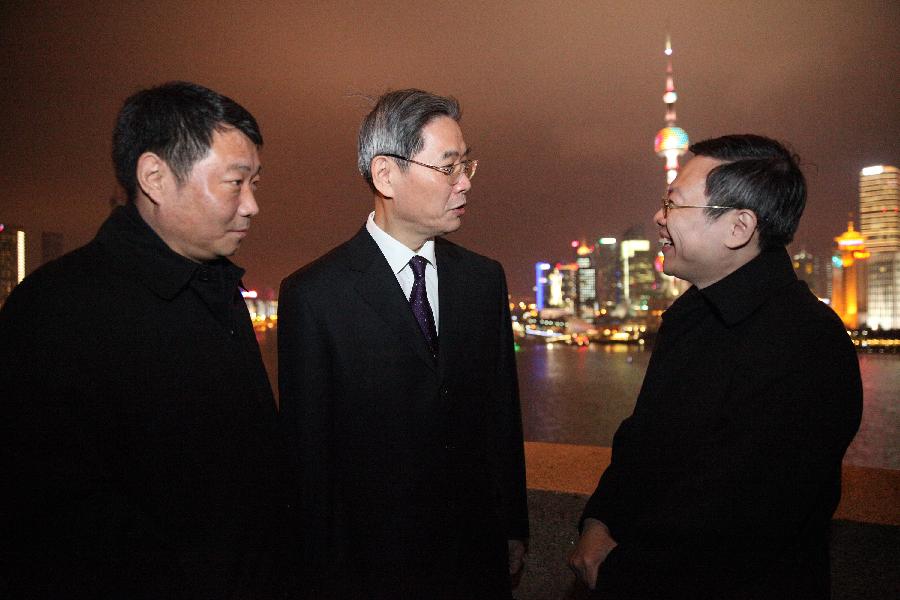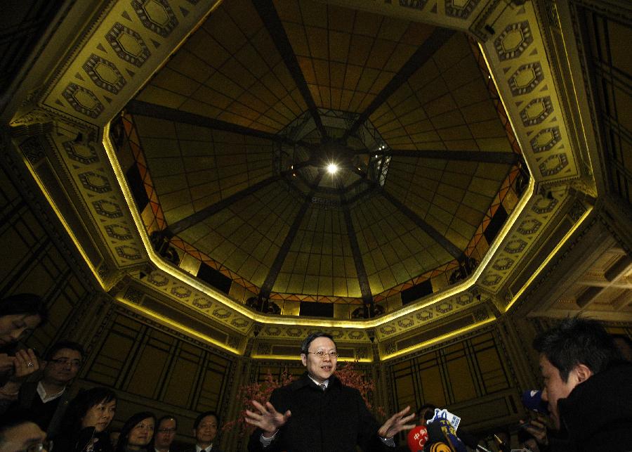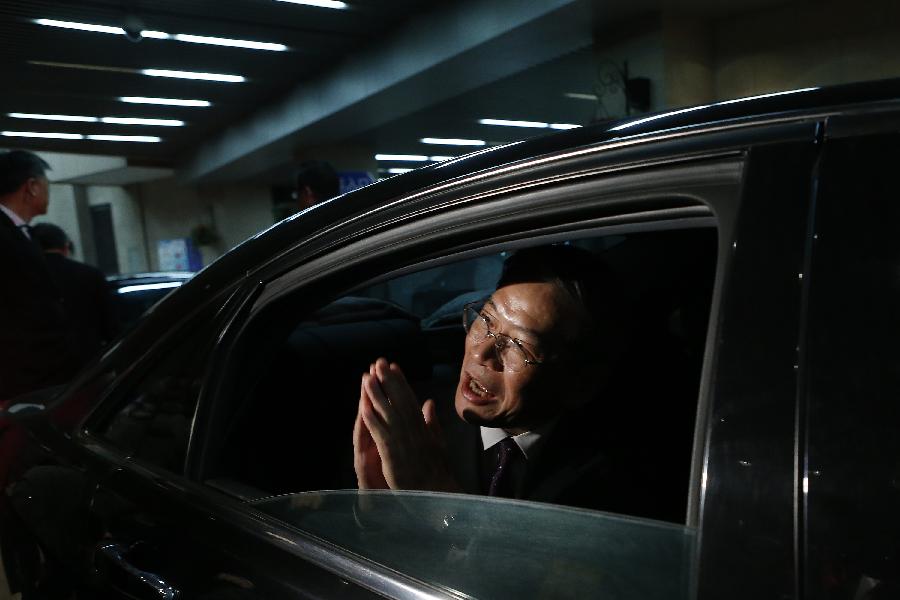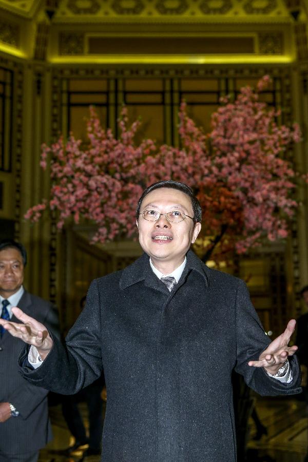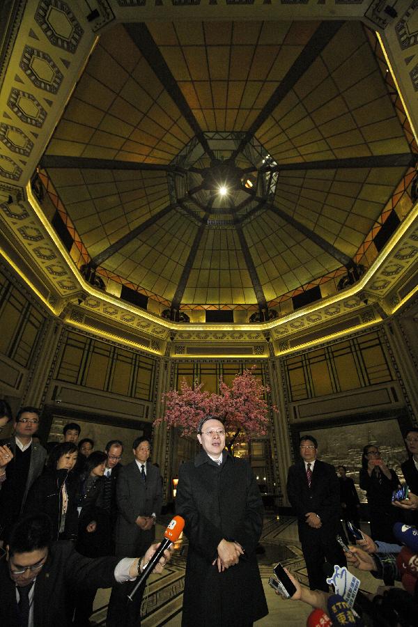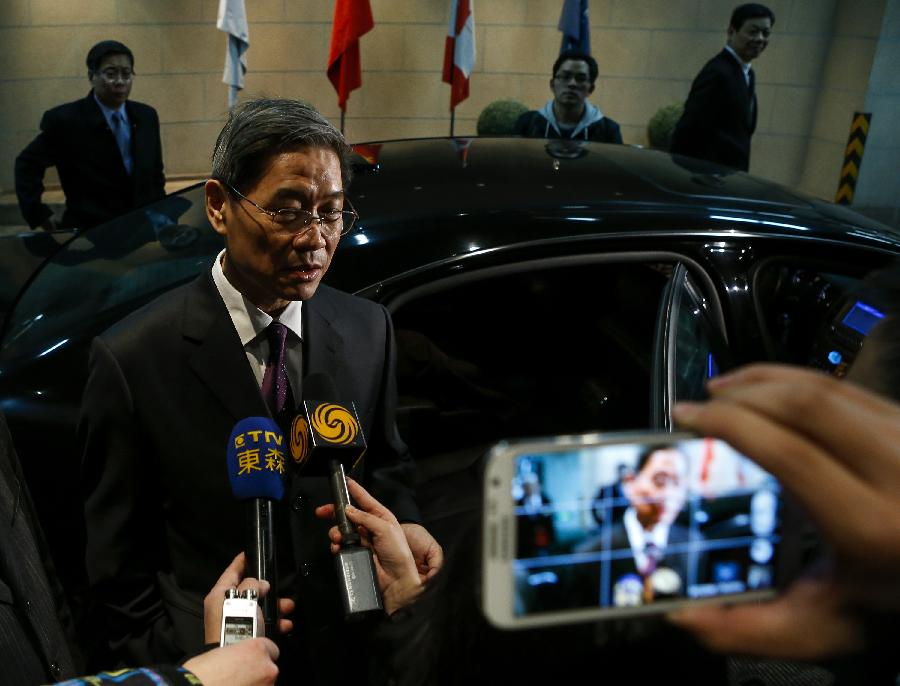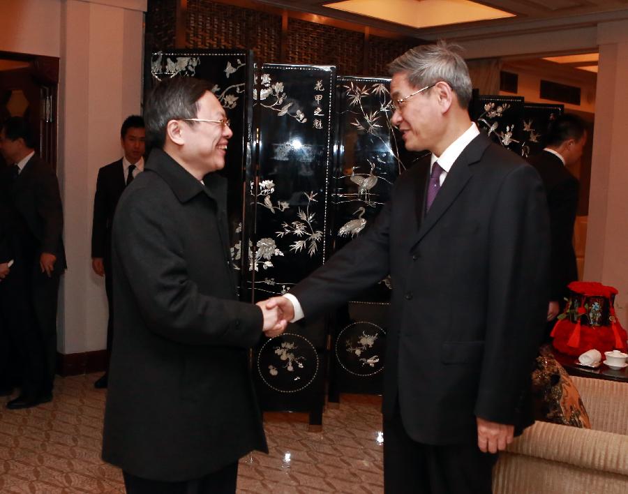 Zhang Zhijun (R), head of the State Council Taiwan Affairs Office (SCTAO), shakes hands with Wang Yu-chi, Taiwan's mainland affairs chief, during their chat at a cafe in the Peace Hotel of Shanghai, east China, Feb 13, 2014. The meeting carried on the legacy of another historic meeting in the same place in 1998. Sixteen years ago, on Oct 14, 1998, Wang Daohan, then president of the mainland-based Association for Relations Across the Taiwan Straits (ARATS), and Koo Chen-fu, chairman of Taiwan's Straits Exchange Foundation (SEF) met at the hotel. (Xinhua)
