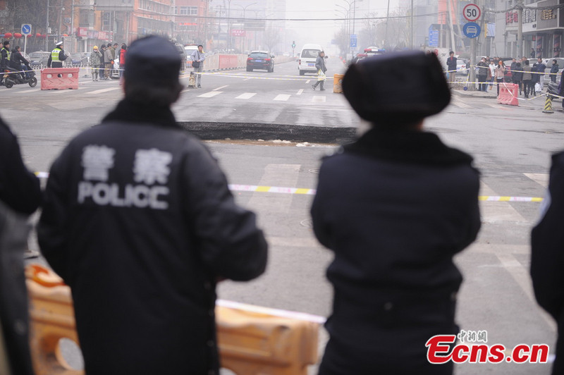 A road collapse occurs near a road crossing at Chaoyang district of Beijing on the afternoon of Sunday. The hole, with a diameter of about six meters and depth of five meters, interrupted traffic in the neighborhood. [Photo/IC]