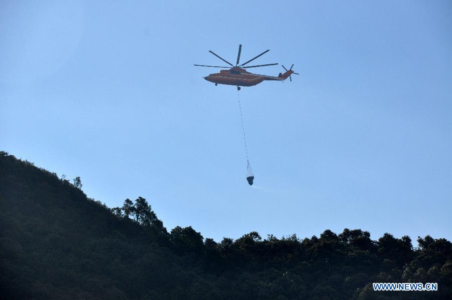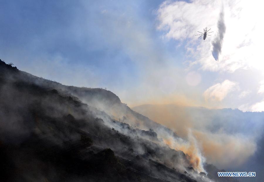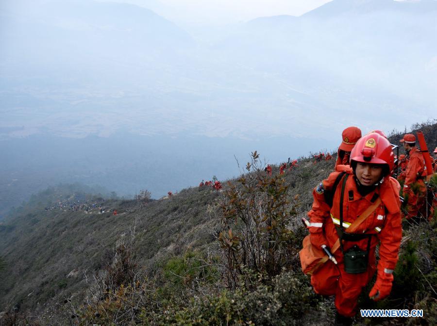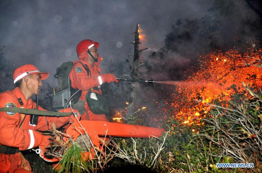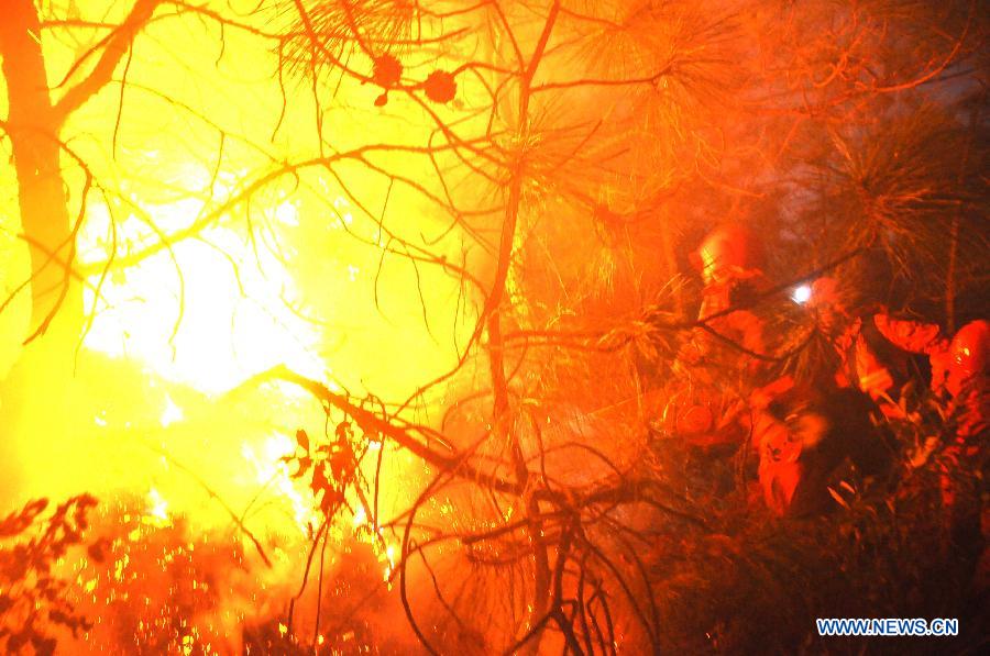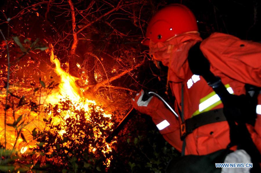 A fire fighter tries to put out a forest fire in Jiancao Village, Mianning County, Liangshan Yi Autonomous Prefecture, southwest China's Sichuan province, Feb 16, 2014. The fire lasted for three days and raged through some 56 hectares of forests in the village. As of 8 p.m. on Sunday, flames had not been extinguished due to strong winds. (Xinhua/Cheng Xueli)
