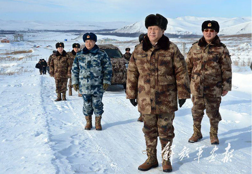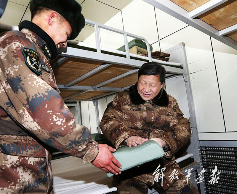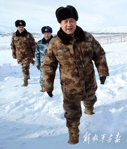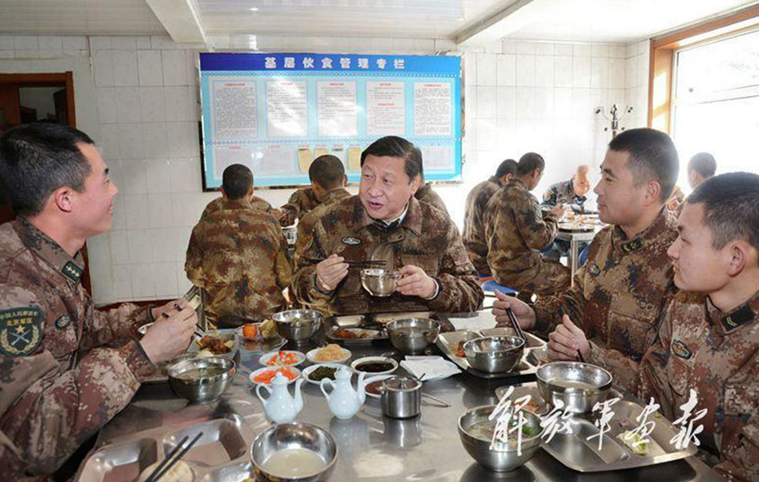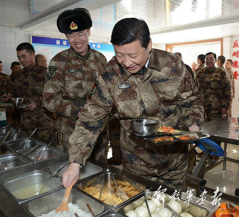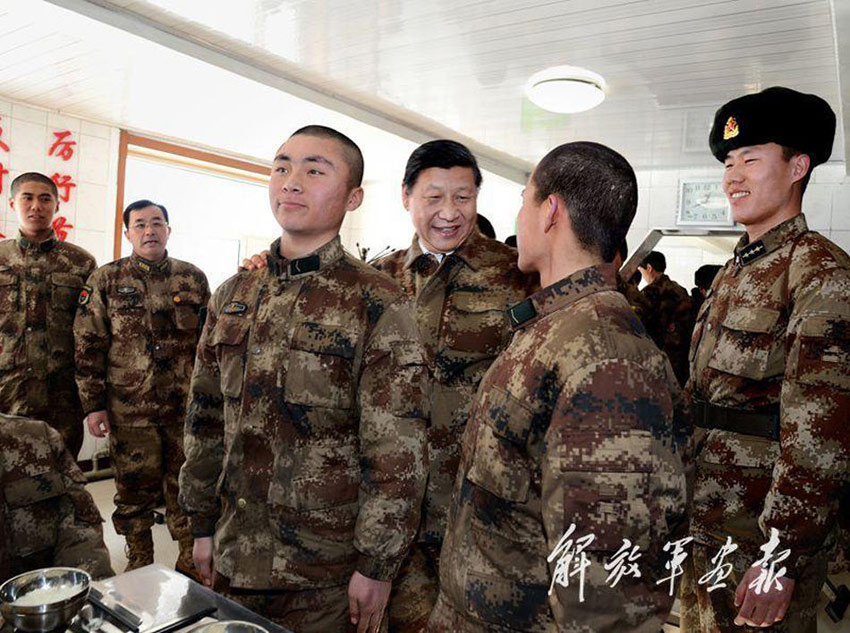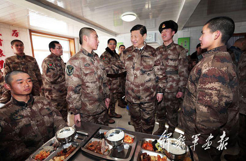 The official website of PLA Daily posted a series photos never published before on February 16, 2014, showing Chinese President Xi Jinping making an inspection visit to the garrison troops based in the Inner Mongolia Autonomous Region on January 26, 2014. Xi extended new year greetings to the soldiers who patrol in chilly snowy weather at 30 degrees Celsius below zero, inspected their daily work, had lunch with soldiers at the dinner hall of the troops and visited their dorm. [Photo: PLA Daily]