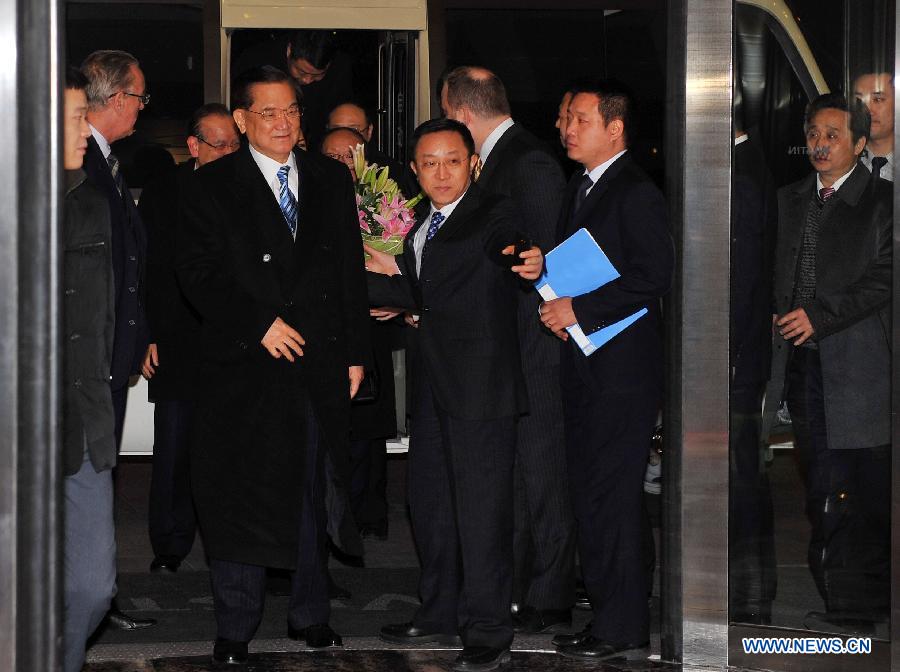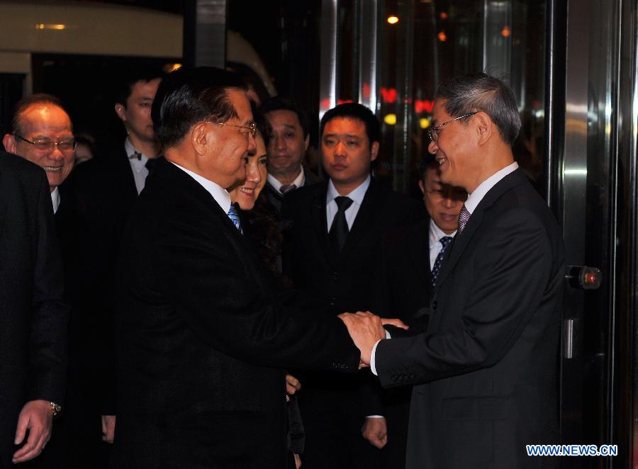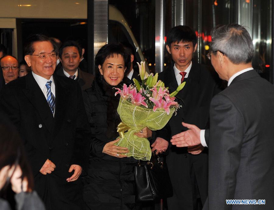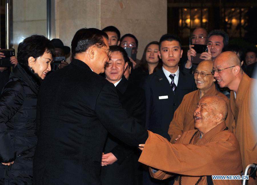 Zhang Zhijun (R), head of the State Council Taiwan Affairs Office, welcomes a delegation led by Kuomintang Honorary Chairman Lien Chan (L), also chairman of a foundation on cross-Strait peaceful development, at their hotel in Beijing, China, Feb. 17, 2014. (Xinhua/Chen Yehua)