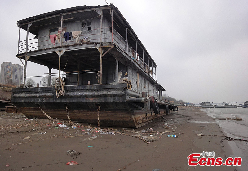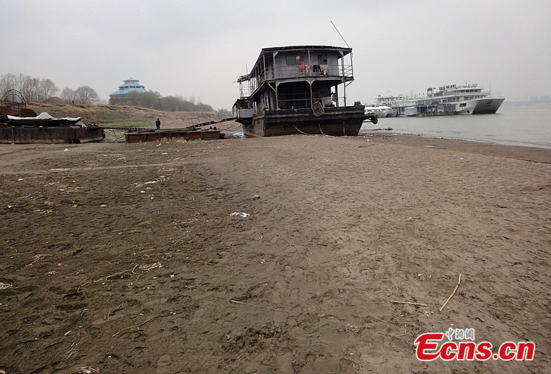The water level in the Wuhan section of Yangtze River falls to 13.97 meters because of little rainfall, according to a monitoring station in Wuhan, Hubei province on Feb. 17, 2014. It's the lowest since records began being kept 148 years ago. [Photo/IC]
