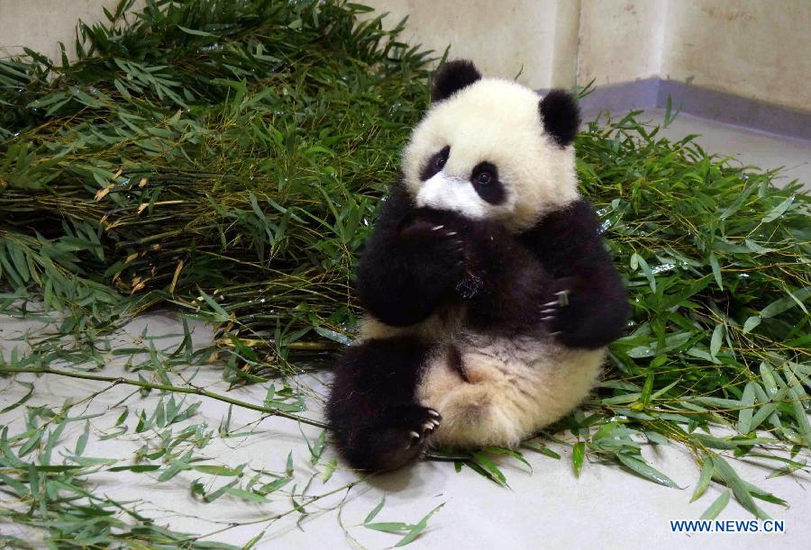 Giant panda cub "Yuan Zai" tries bamboo at the Taipei zoo in Tapei, southeast China's Taiwan, Feb 18, 2014. The seven and a half-month-old cub has grown her weight to 19.3 kilograms. (Xinhua/Taipei Zoo)