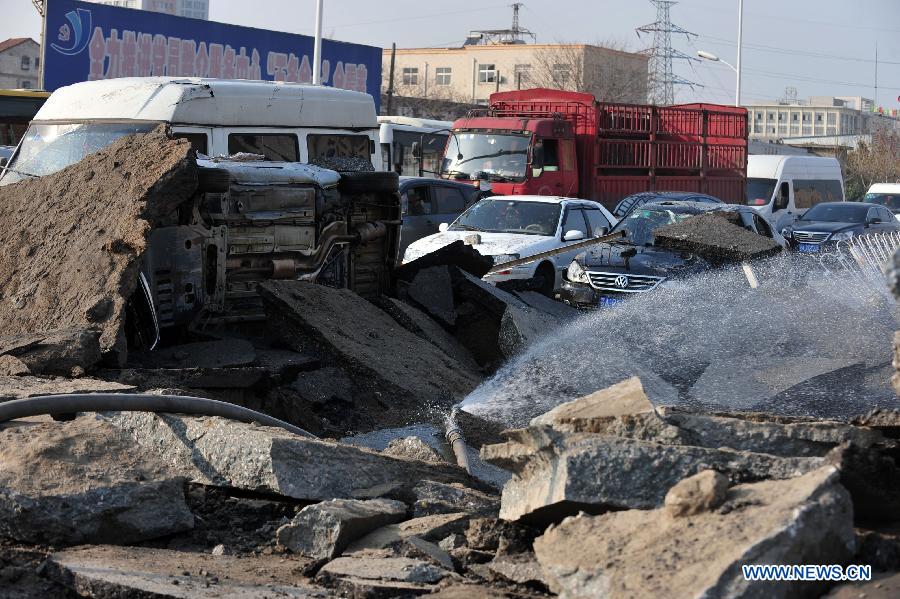 Photo taken on Feb. 20, 2014 shows an explosion site on a road in Qiaokou District of Wuhan, capital of central China'a Hubei province. According to the local fire department, three people were injured in a methane gas explosion in Wuhan on Thursday, which collapsed an underground sewage pipe. (Xinhua)