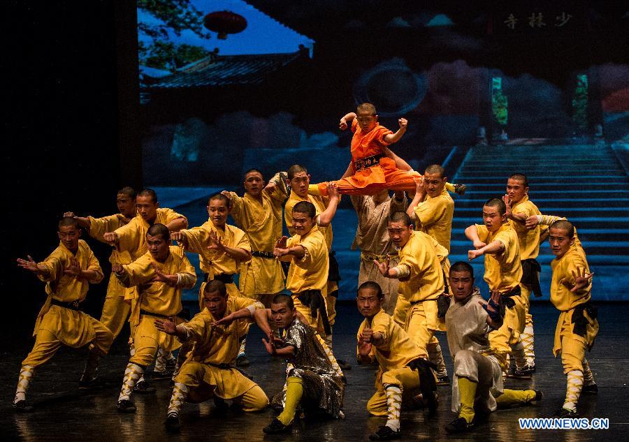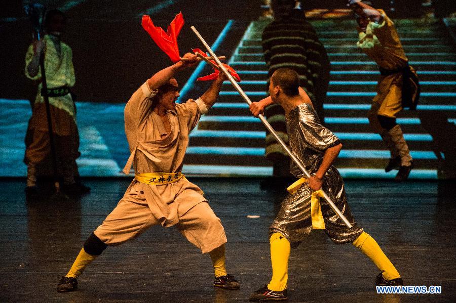 Chinese Shaolin monks perform mmartial arts at Suzanne Dellal Center in Tel Aviv, Israel, on Feb 19, 2014. As a part of the Happy Chinese New Year of Horse 2014 Spring Celebrations, the performance of the Shaolin martial arts, a Chinese demonstration of stage combat drawn from hundreds of years of tradition and practice originated from Shaolin Temple in central China's Henan Province, was presented here on Wednesday night. (Xinhua/Li Rui)