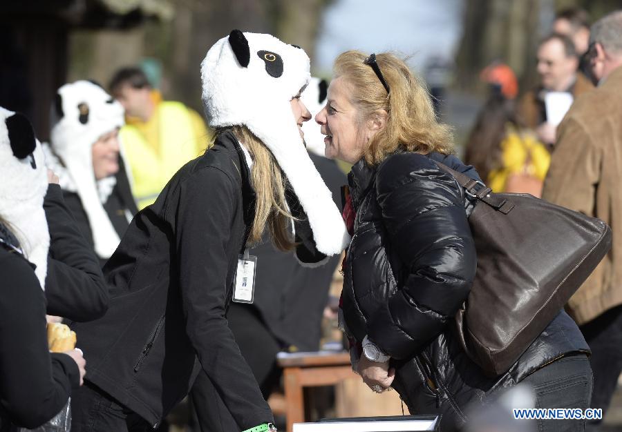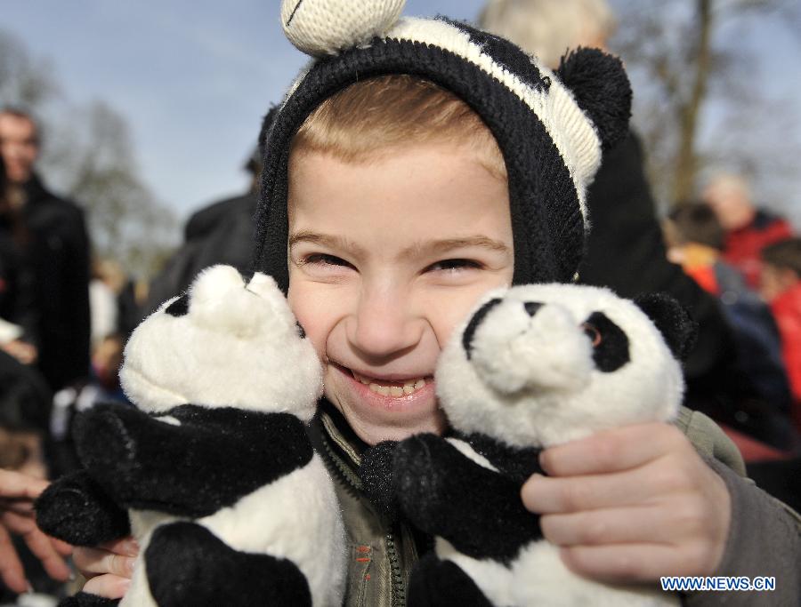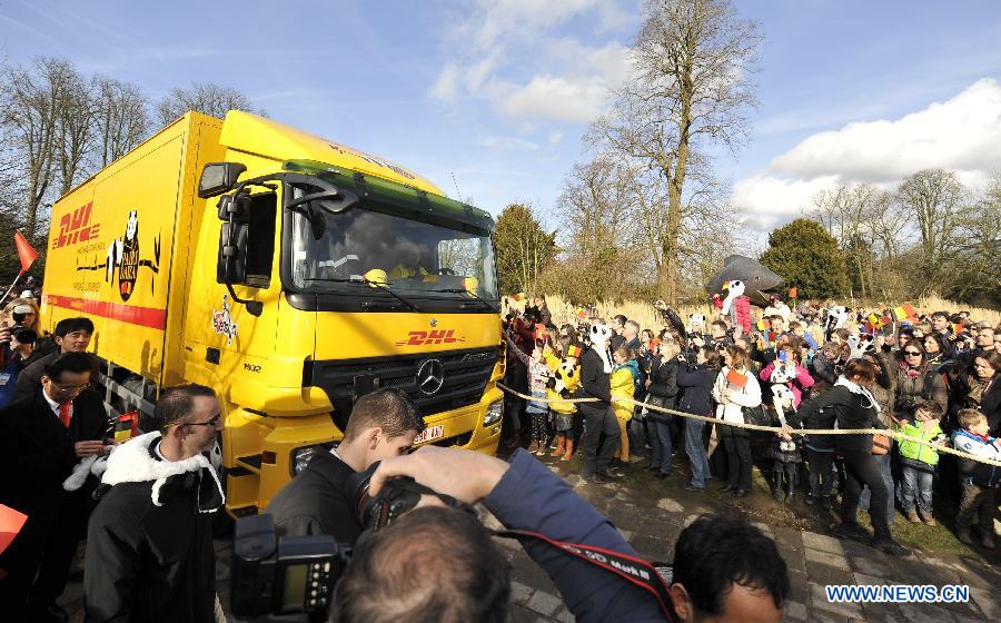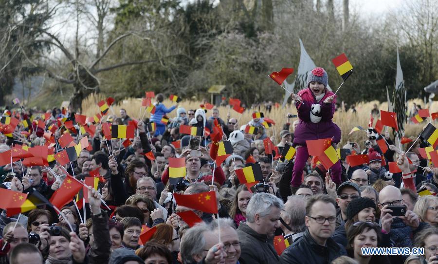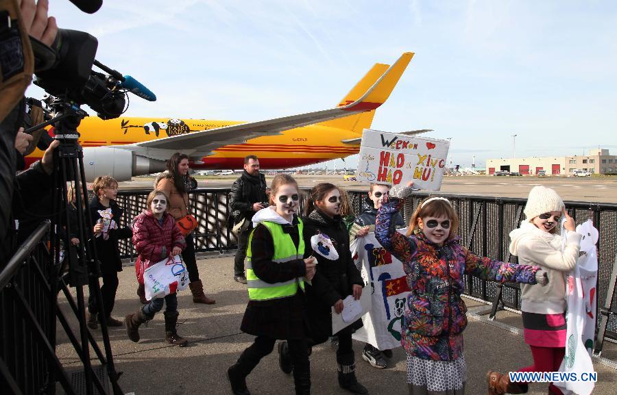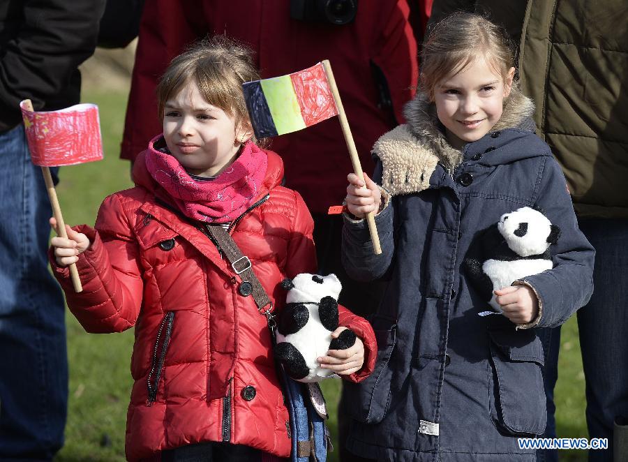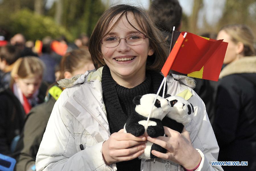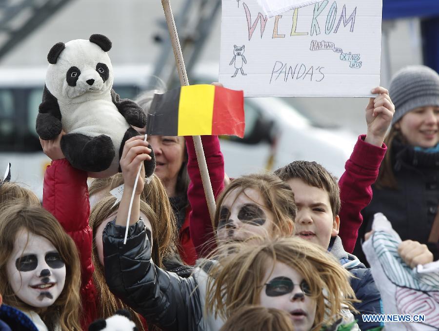Children welcome giant pandas Xing Hui and Hao Hao at the Brussels National Airport in the capital of Belgium on Feb. 23, 2014. The pair of giant pandas, Xing Hui, the male, and Hao Hao, the female, arrived in Belgium Sunday, on lease from their breeding center in southwest China's Sichuan Province. They are both four years old and will stay in Belgium for the next 15 years. (Xinhua/Sun Wen)