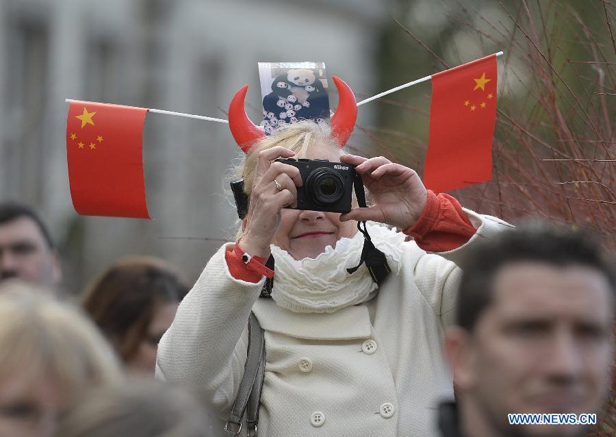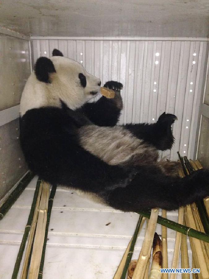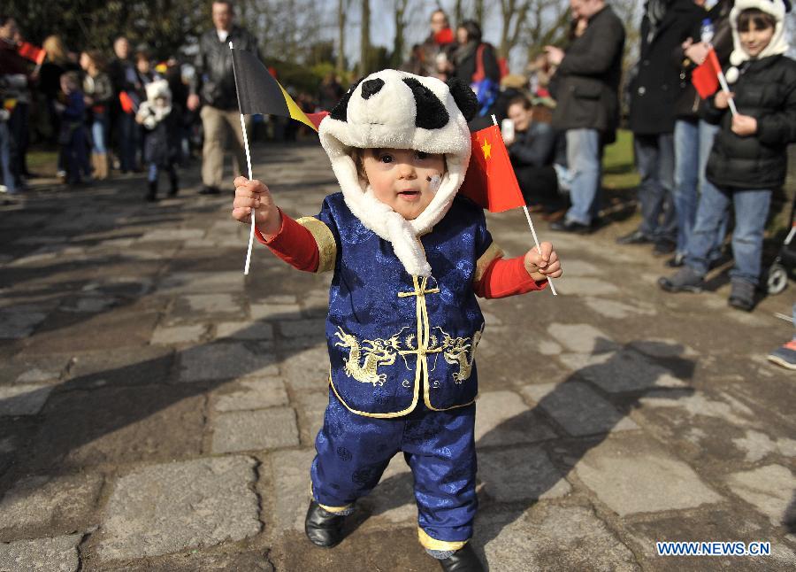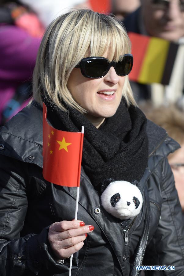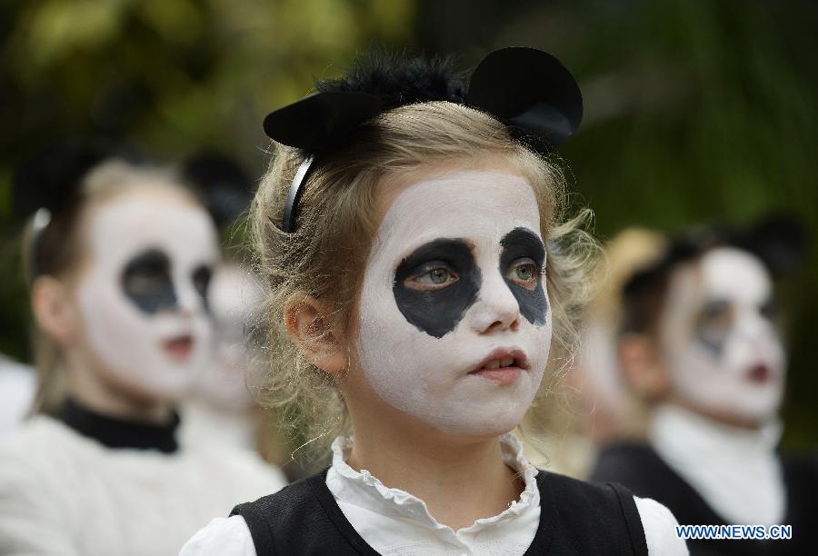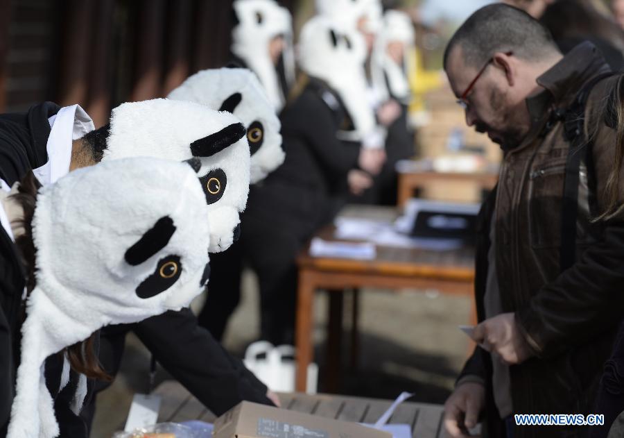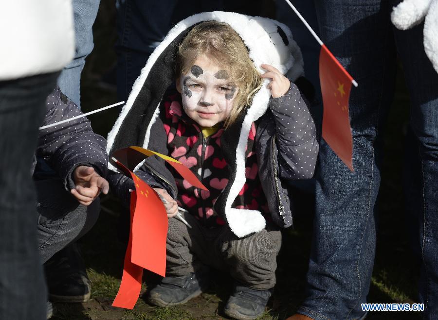 Children welcome giant pandas Xing Hui and Hao Hao at the Brussels National Airport in the capital of Belgium on Feb. 23, 2014. The pair of giant pandas, Xing Hui, the male, and Hao Hao, the female, arrived in Belgium Sunday, on lease from their breeding center in southwest China's Sichuan Province. They are both four years old and will stay in Belgium for the next 15 years. (Xinhua/Sun Wen)