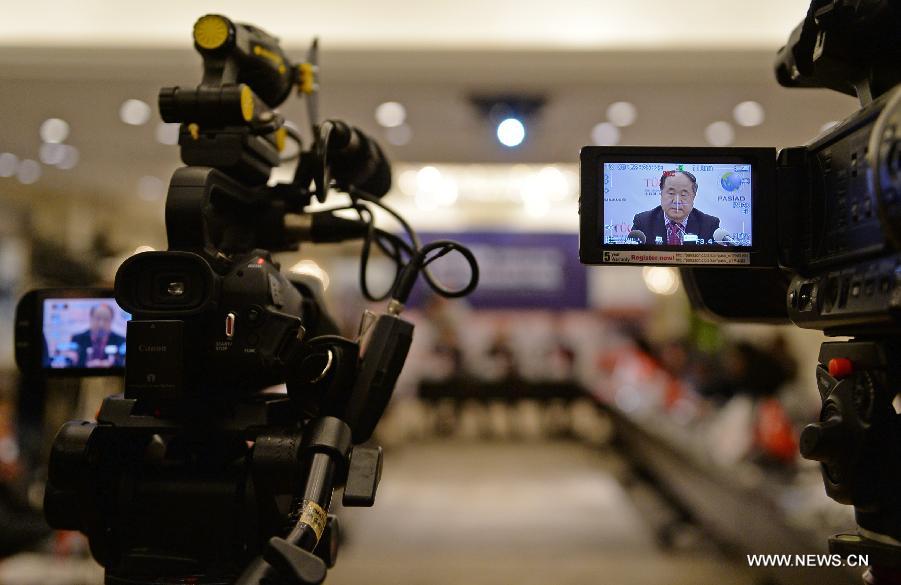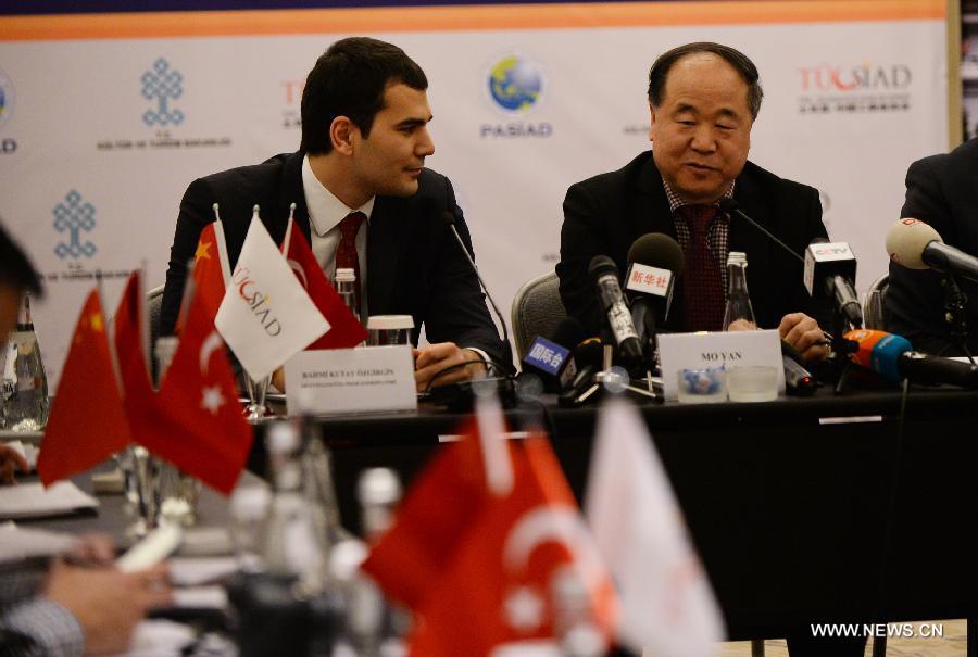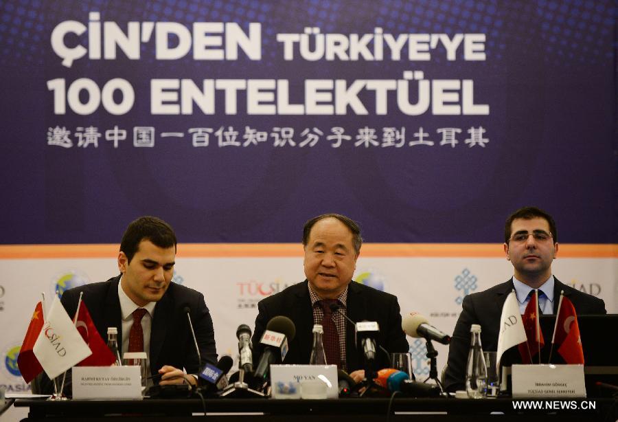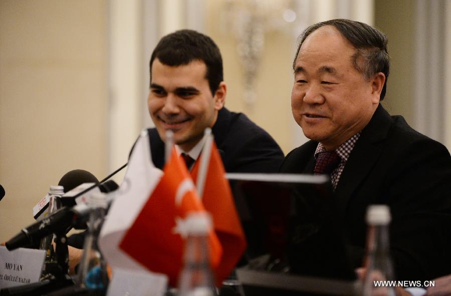 Chinese writer and Nobel laureate Mo Yan (C) speaks at a press confrence in Istanbul, Turkey, on Feb. 22. Mo Yan, who is taking a week-long tour to Turkey, called on the Chinese and Turkish governments Saturday to make further efforts in translating more works in a bid to increase better understanding and friendship between the people of the two countries. (Xinhua/Lu Zhe)