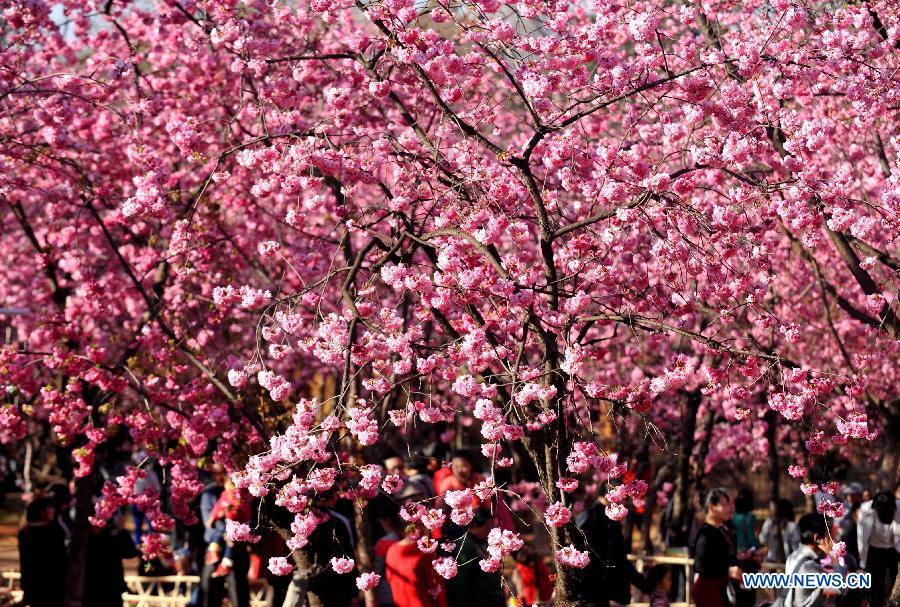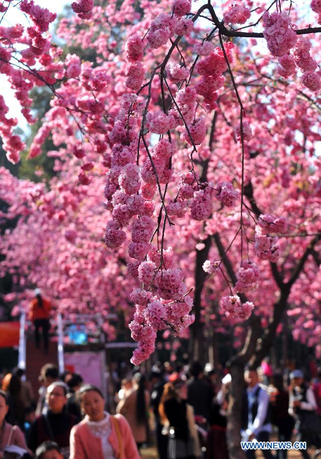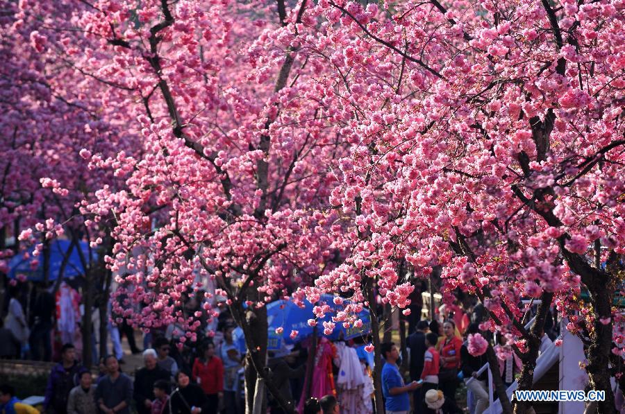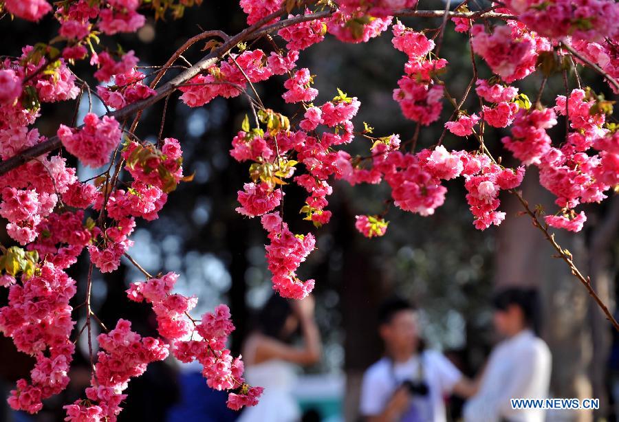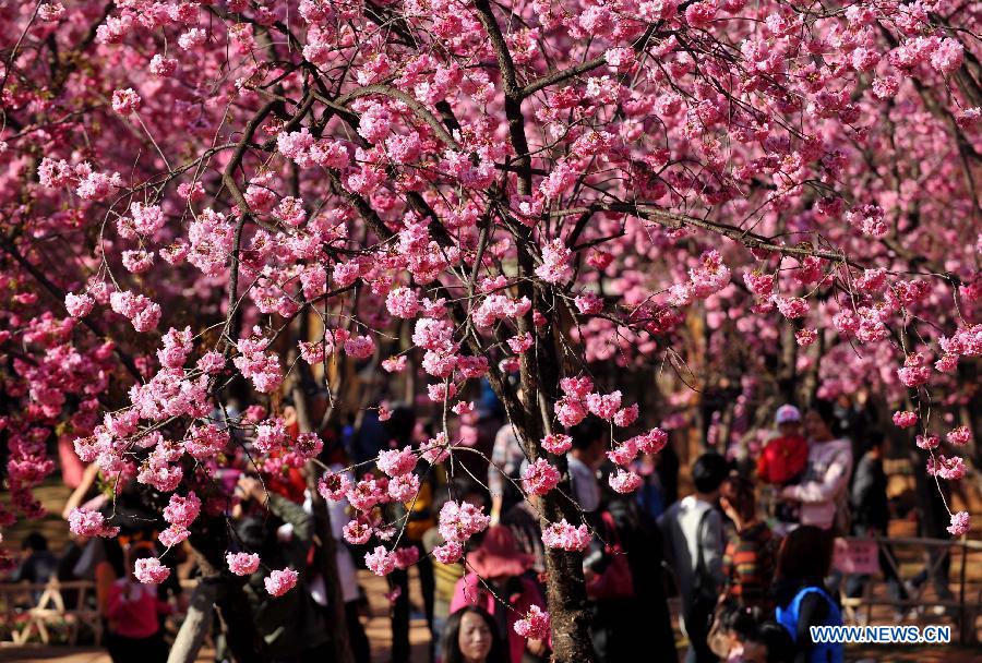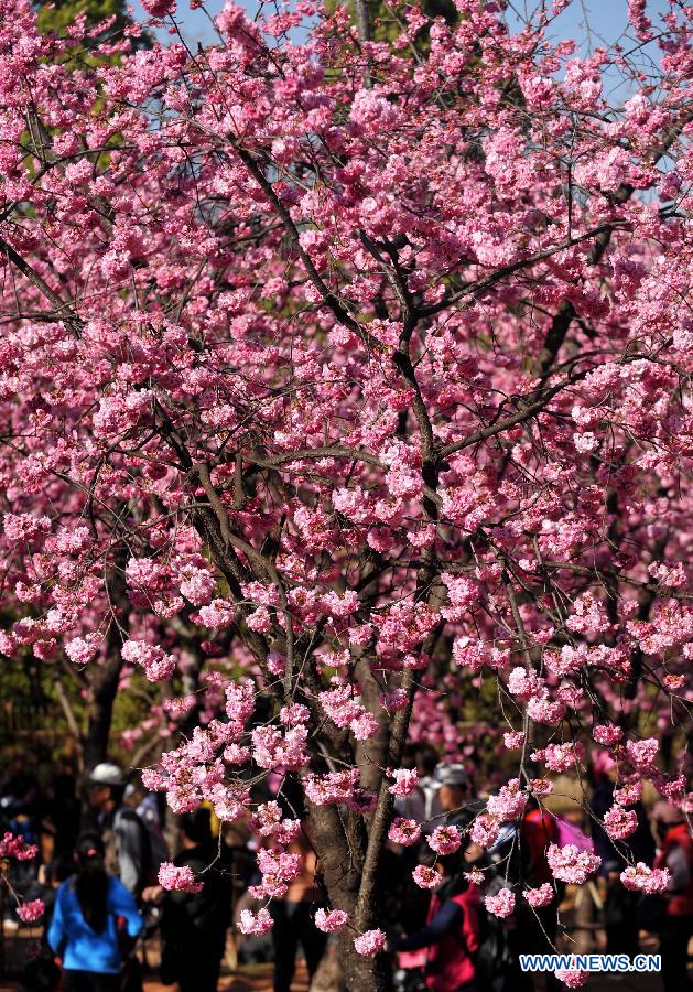 Visitors enjoy themselves under cherry blossoms at Yuantongshan Park in Kunming, capital of southwest China's Yunnan Province, Feb. 23, 2014. Kunming is know as the "spring city" for its mild weather throughout the year. (Xinhua/Lin Yiguang)