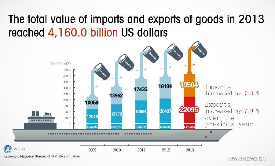 The graphic shows imports and exports of goods, 2009-2013. (Xinhua/Ma Yan)